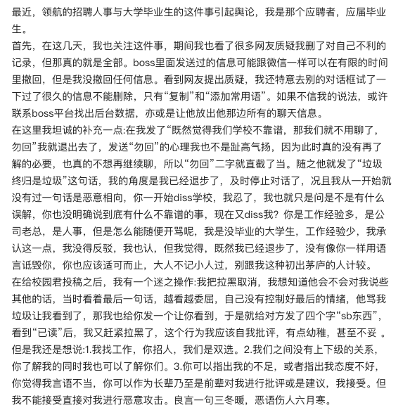 后续双方在沟通中情绪都有波动,都说了过激的言论,但对方在提供给媒体的截图中并未完全展现出来。HR对求职者说“垃圾终归是垃圾”后,对方实际上还回怼了一句“**东西”。