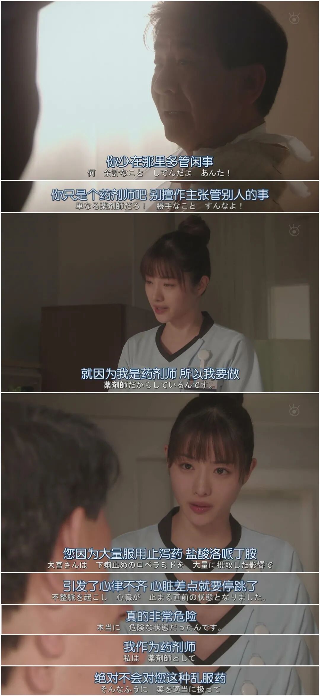她承认了前两集确实是这样的,把医生拍的像反派,但其实随着剧情深入,医生与药剂师之间的关系会转变,随着交流,思想是会互相理解,葵绿也不是绝对正确的,本剧是讲一整个药剂师团队的故事。