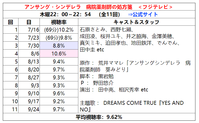 就收视率数字来说,平均9.62%,是富士电视台木十档连续剧近两年的最佳收视率。
