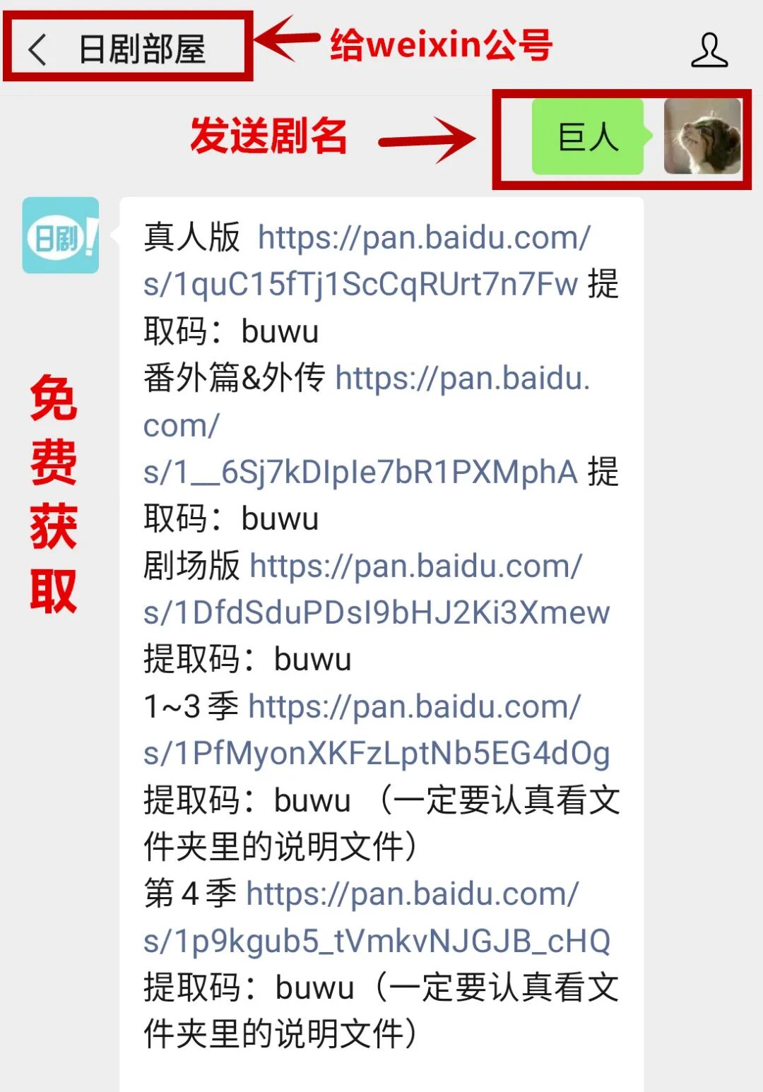 如下图所示,重新在公众号【日剧部屋】的后台发“巨人”,可获取最新的链接,日剧的资源也是这样操作获取!(敲黑板!)