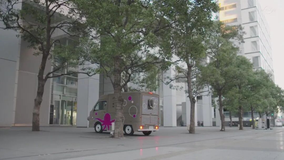 青山开着一辆印有粉色章鱼的车子穿梭于东京的大街小巷,这台车就是他的办公地点。