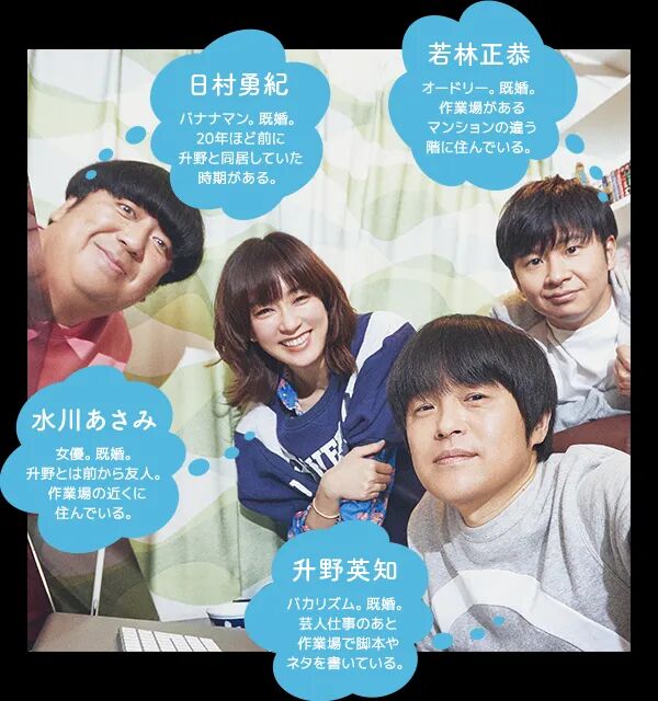 《住住》是搞笑艺人笨蛋节奏(升野英知)自编自演的作品,演员们都出演自己,讲述他们住进了同一个公寓,互相帮忙解决人生中的烦恼。