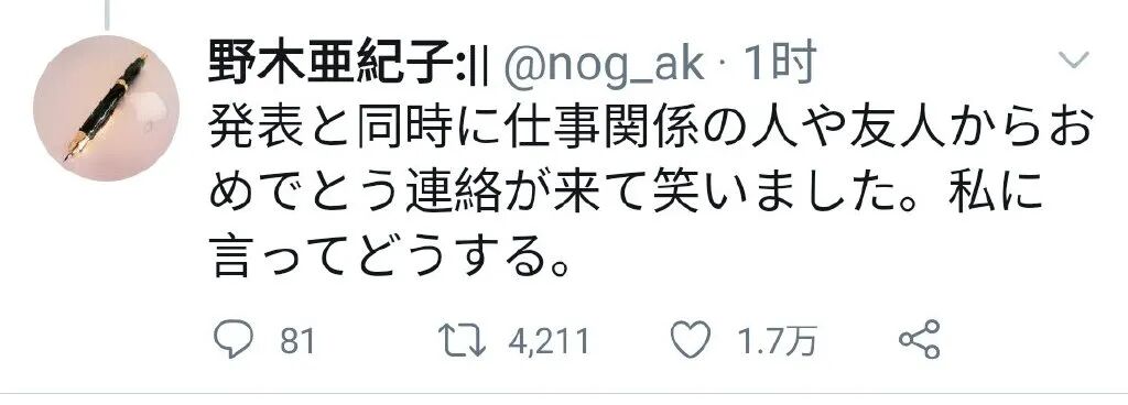 连编剧野木亚纪子都懵逼非常多的人给自己也发了祝福,宛如是她的孩子结婚了一样。