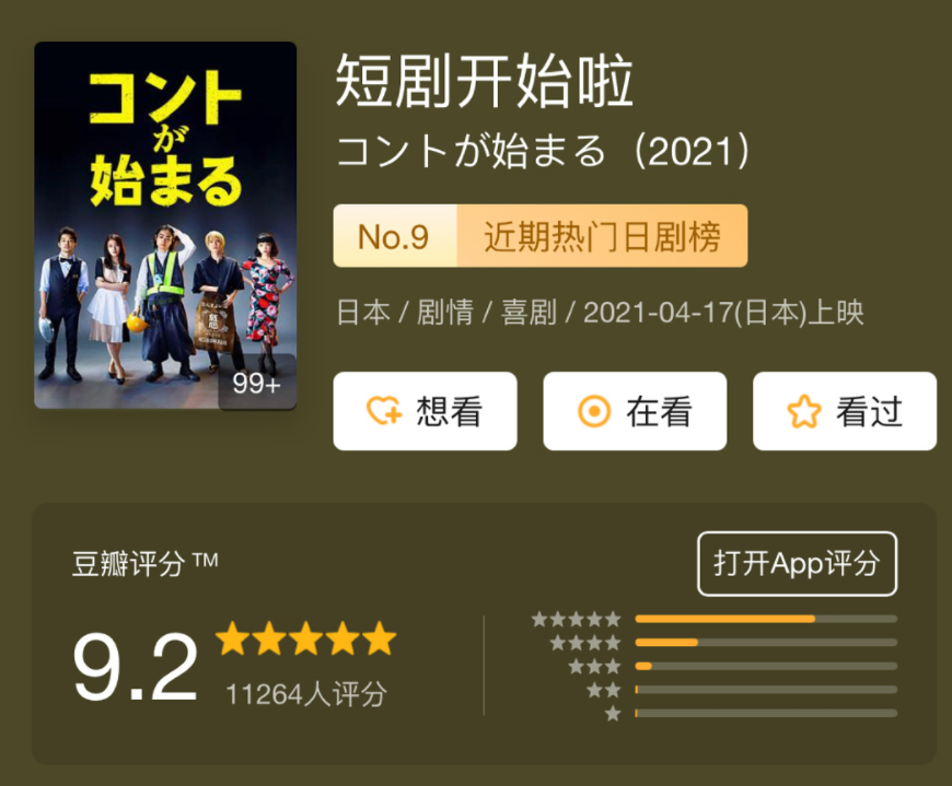 《短剧开始了》在豆瓣拿到了9.2分,甚至超过了《大豆田永久子与三名前夫》,是本季评分最高的日剧。