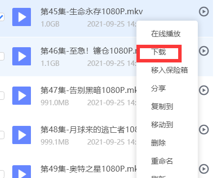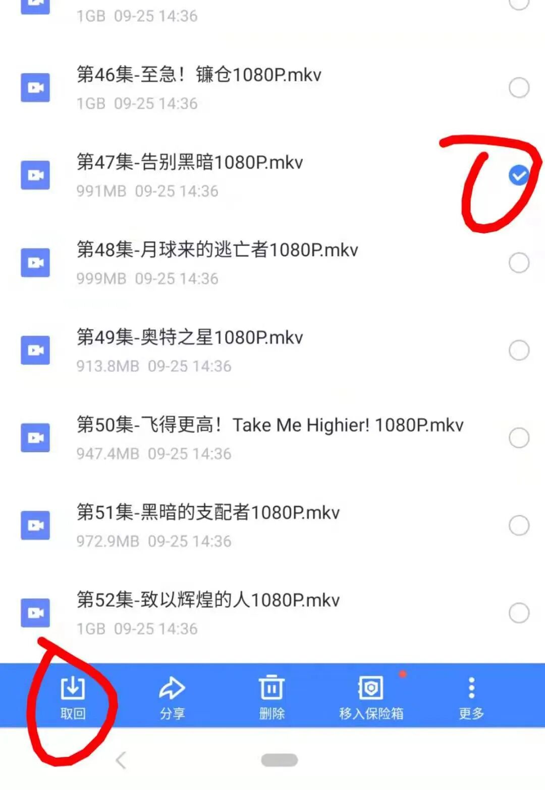 手机端先勾选所想下载的文件,再点左下角的【取回】,就开始下载了(边下边播)