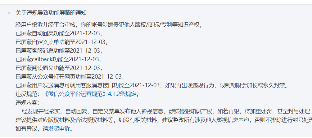 现在大家在后台发剧名,收到了如上图的提示。是的,这个号的自动回复又被屏蔽了。。。。