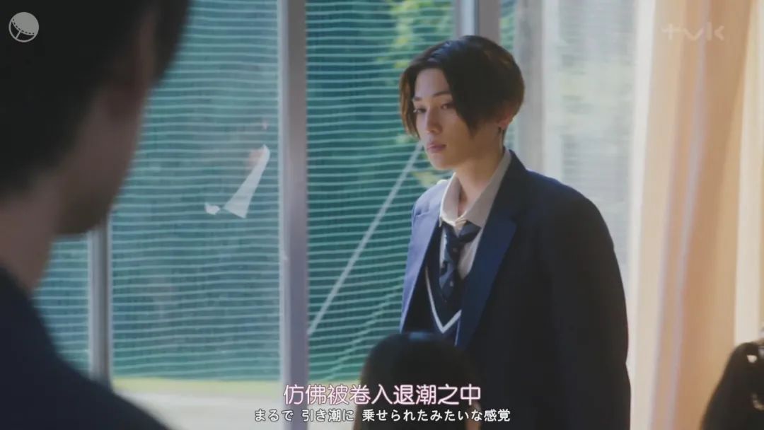 平良瞬间被这位迟到的男同学吸引住了,目不转睛的跟随他而动,内心OS“他真的很美丽。如同被卷入退潮,受到了什么力量的牵引,无法他身上移开目光”。