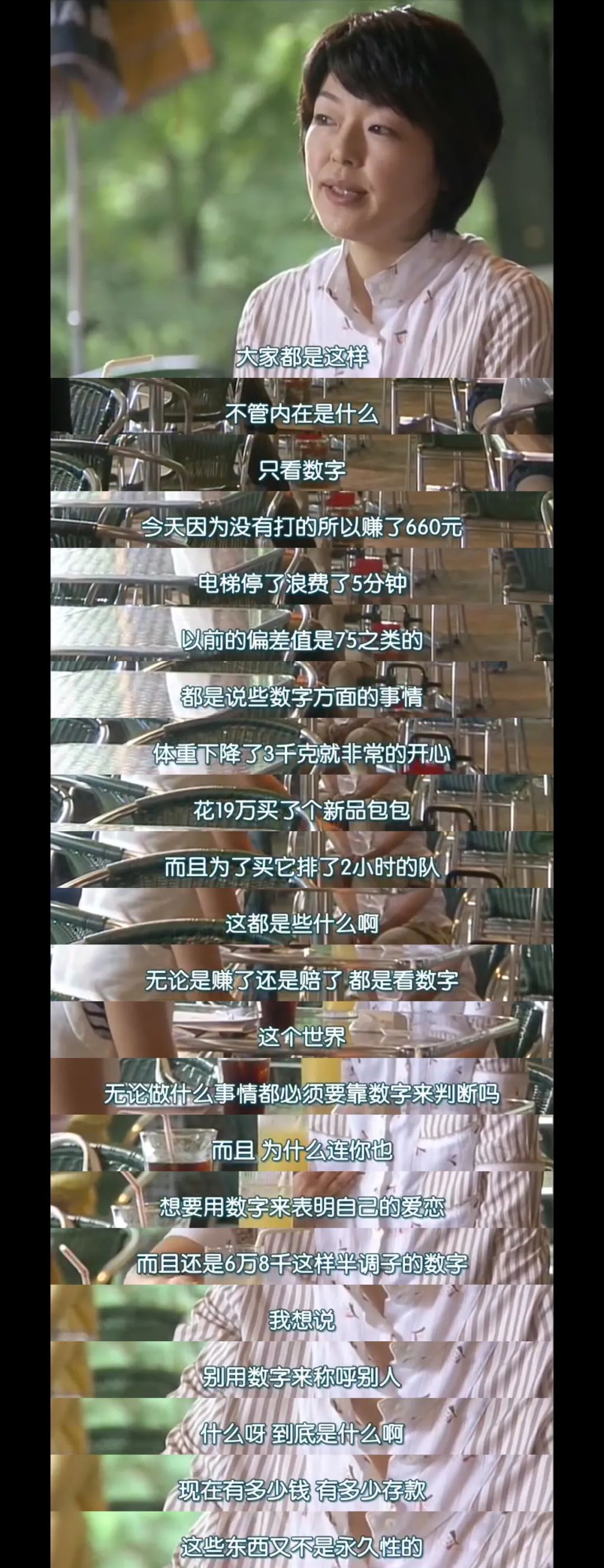 以及,这部剧虽然有很多的金句,却没有说教感,很多台词都贴近生活,能一下子点醒人,就比如上面这句关于日常生活被过于数字化的讨论——我们的人生不是用几个数字来衡量的。