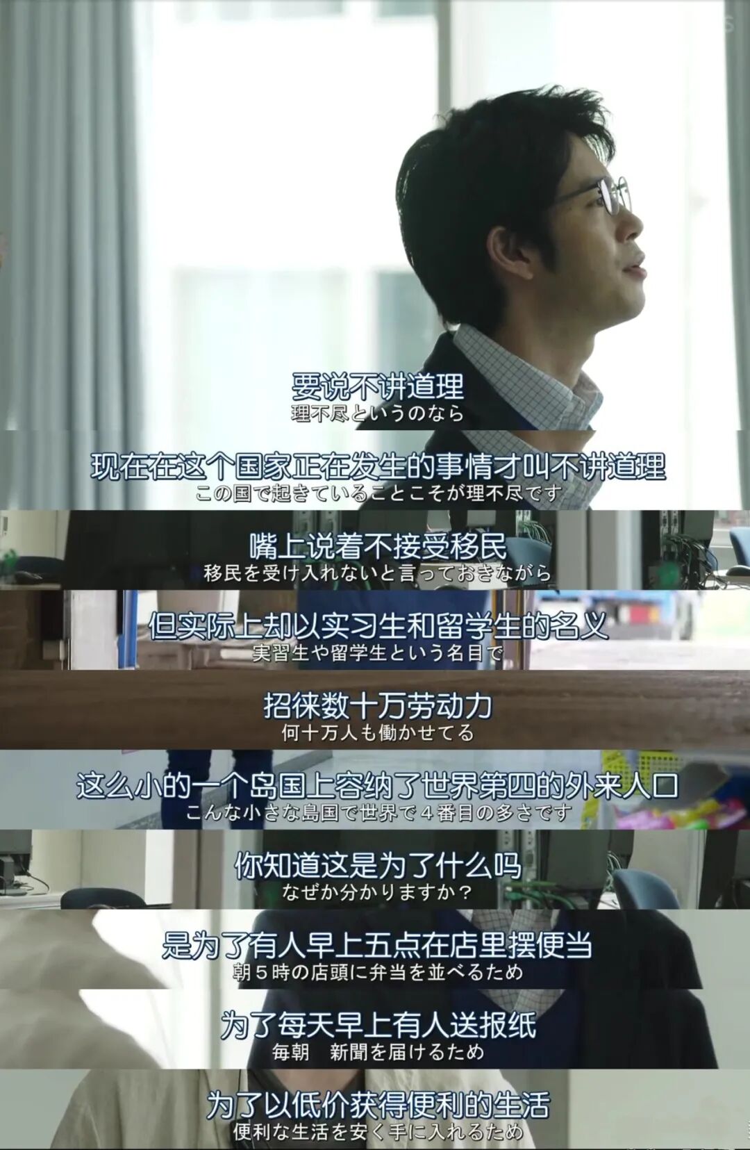 除了关心女性,野木也关心其他弱势群体,还有一集讲的是越南移民问题,直接抨击了日本现在的移民制度。(其实早在电影《虚假新闻》中,野木就有所涉及)