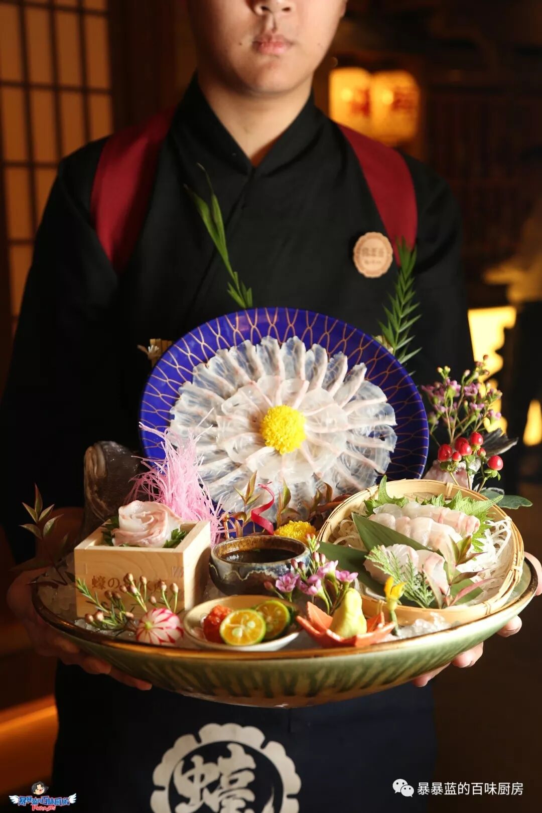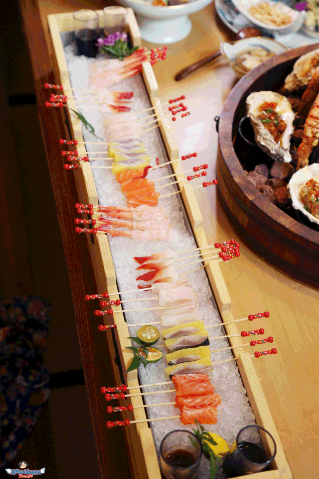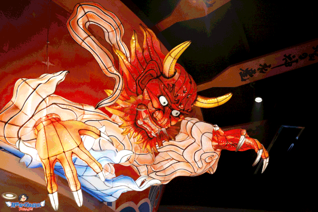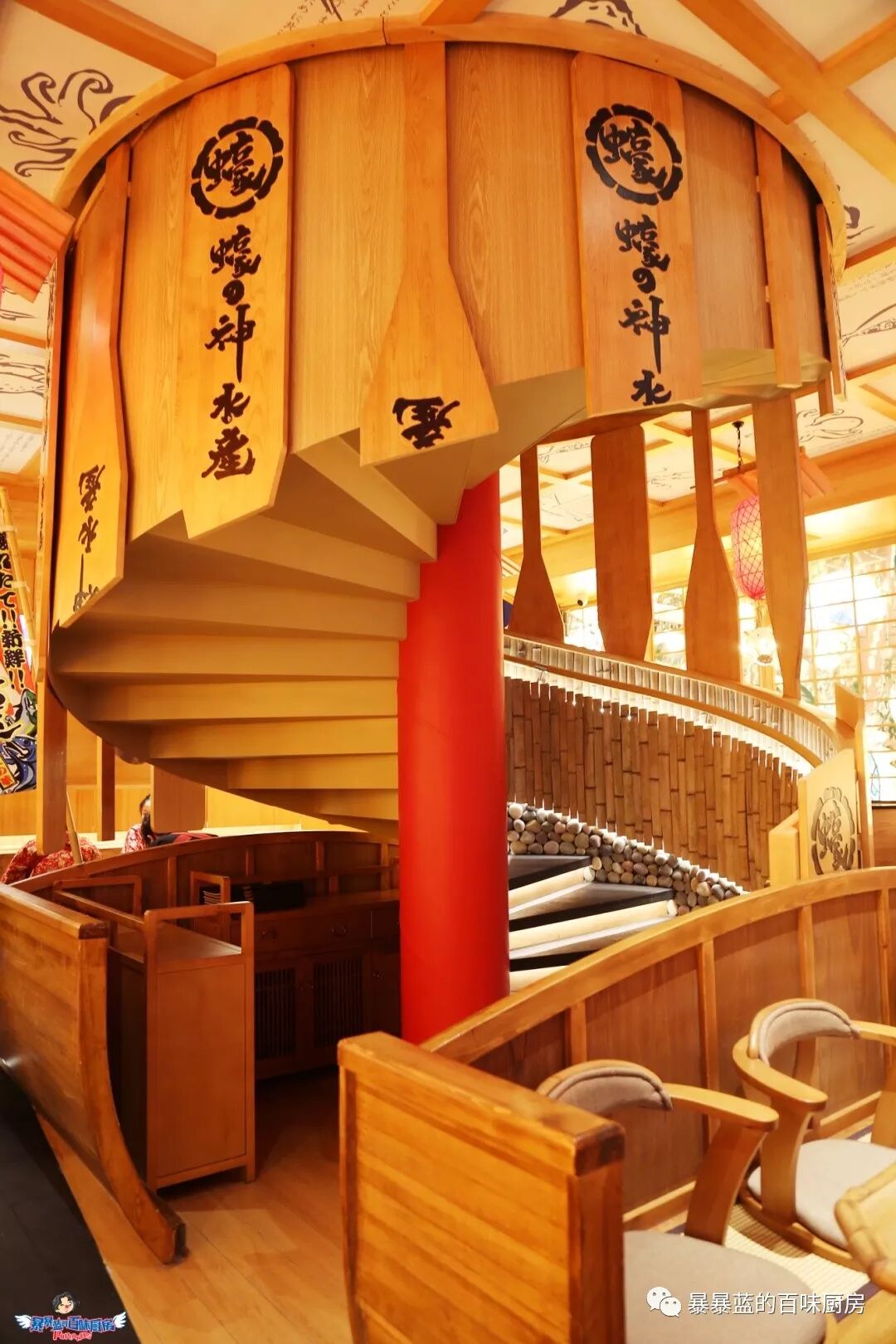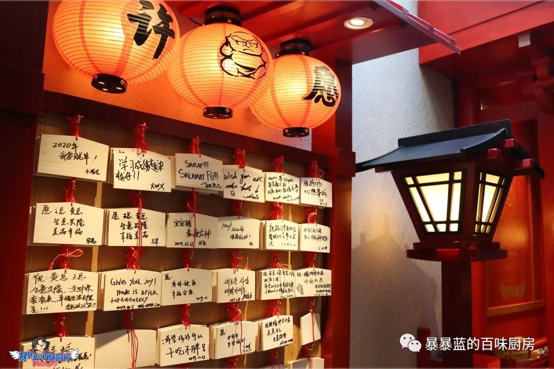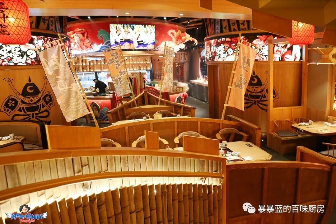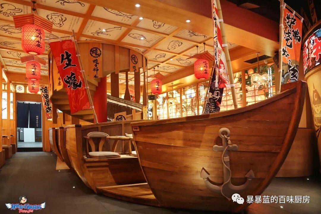 料理台是一个被海浪簇拥着的巨型船身,头顶悬着日本的祭祀花灯,轻灵飘动,据说待到节日,这里还会上演盛大的开鱼仪式……