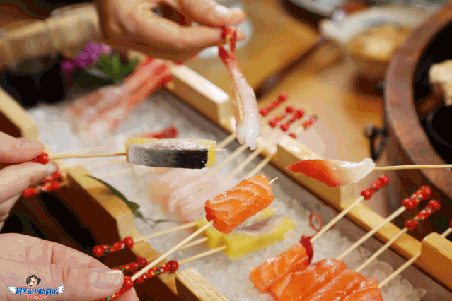 三文鱼、甜虾、鲷鱼、北极贝、希鲮鱼,每四串一组,在长长的木盘中循环出现。来自四面八方的手,都能以一个最轻松的角度和姿势吃全每一样!