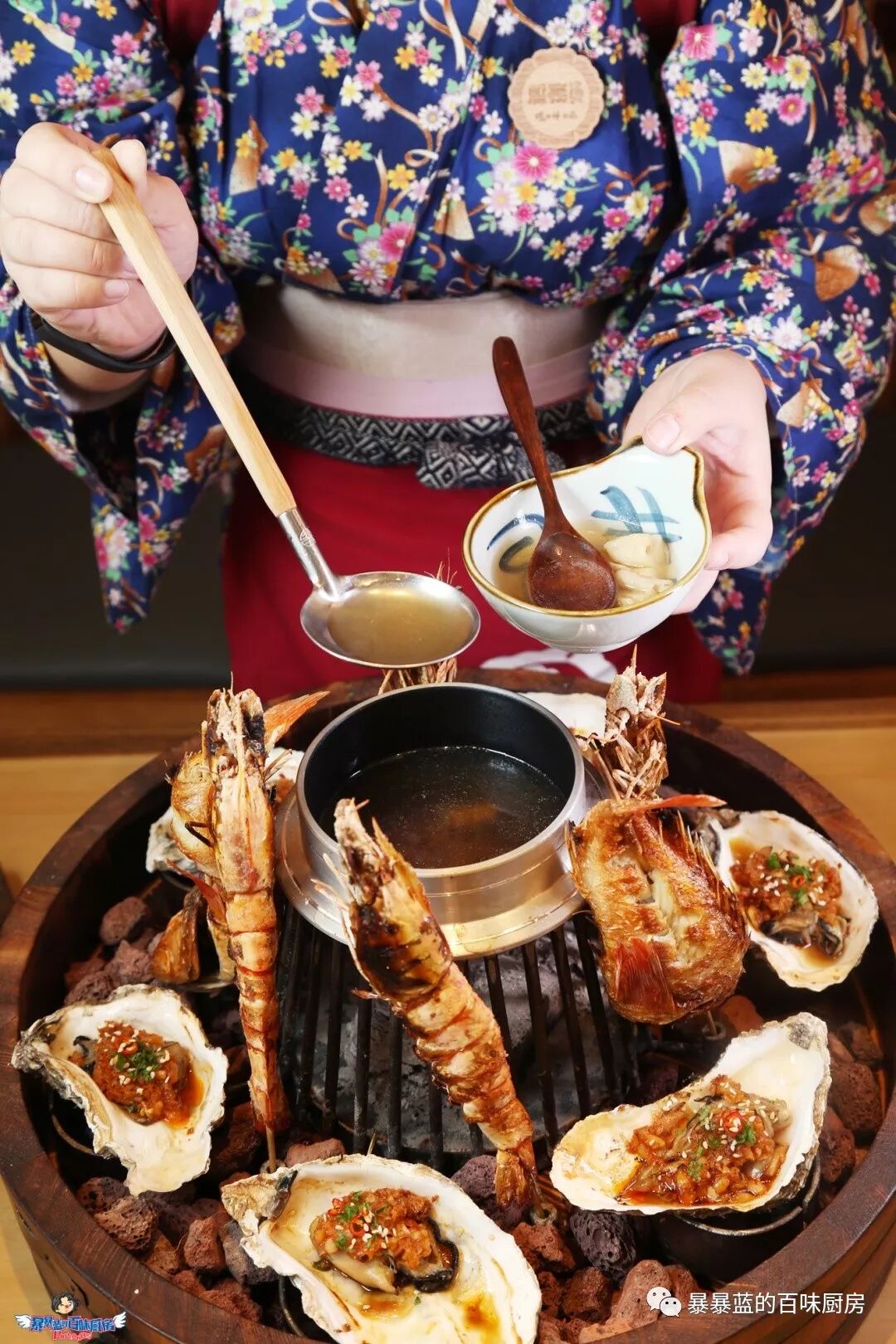 长过手掌的俄罗斯虎虾和肉质肥厚的香鱼威武地围守炉子,巨型的韩国进口生蠔乖乖地躺在碳上,木盖封锁了海鲜松茸汤的鲜味,环保的椰壳碳保证它们持久而稳定的温度。