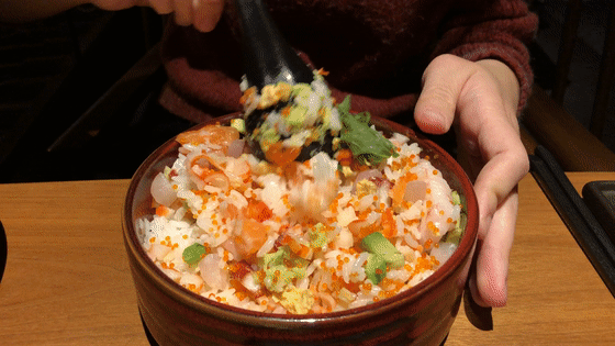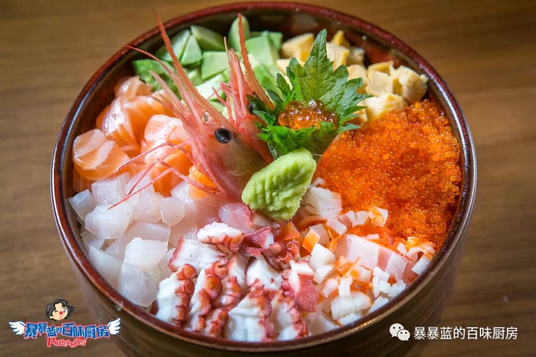鲷鱼、蟹柳、三文鱼、蟹籽、玉子烧、甜虾……8种食材汇聚一碗,野蛮的搅动,促成诱人的芬芳。鲜无处可逃,随着一抹现磨的山葵入口,爽辣、清新之间,让人忘了窗外的季节。