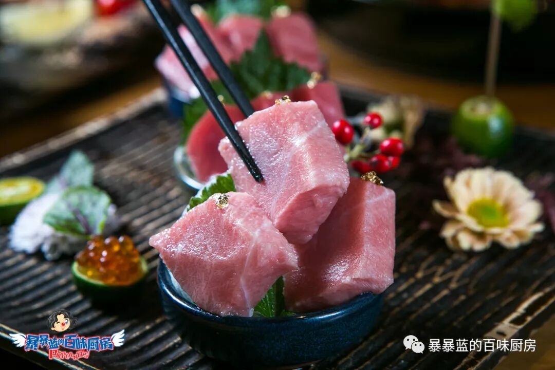 来自日本、西班牙海域的蓝鳍金枪鱼,大腹、中腹、赤身集于一盘。