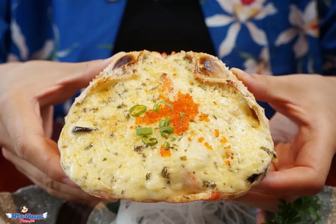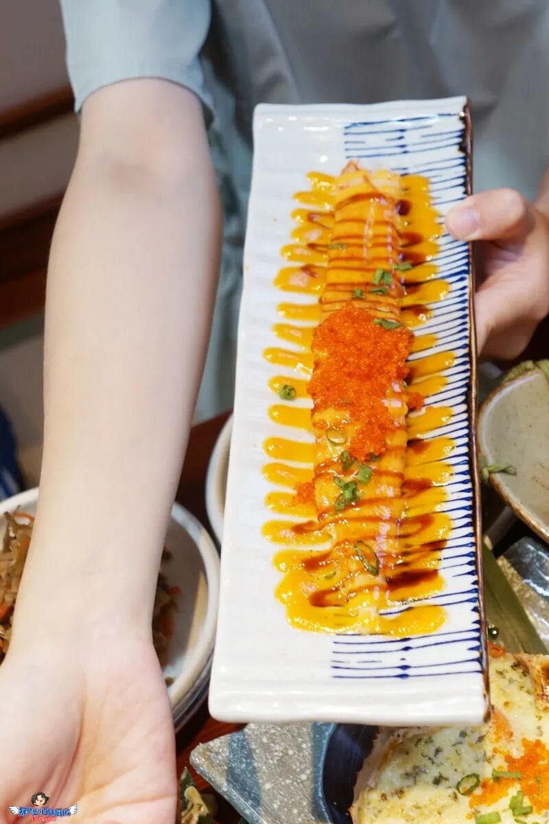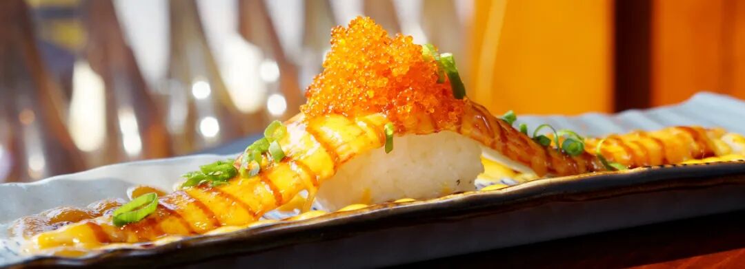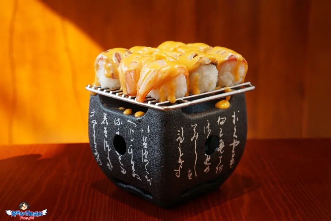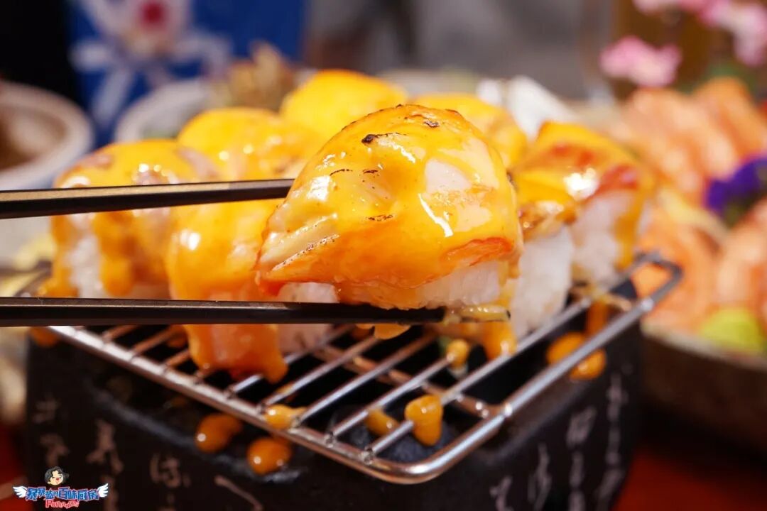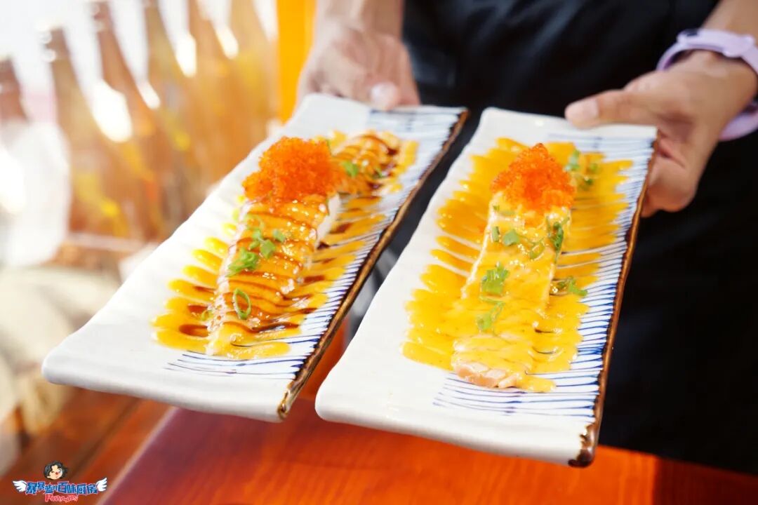 一小块米饭撑起一条跟小臂差不多长的三文鱼,芝士蟹籽铺满三文鱼,经炙烤,喷射出迷幻的颜色和香味儿。