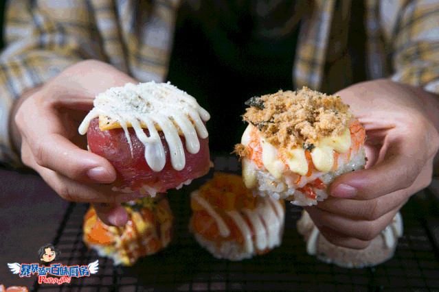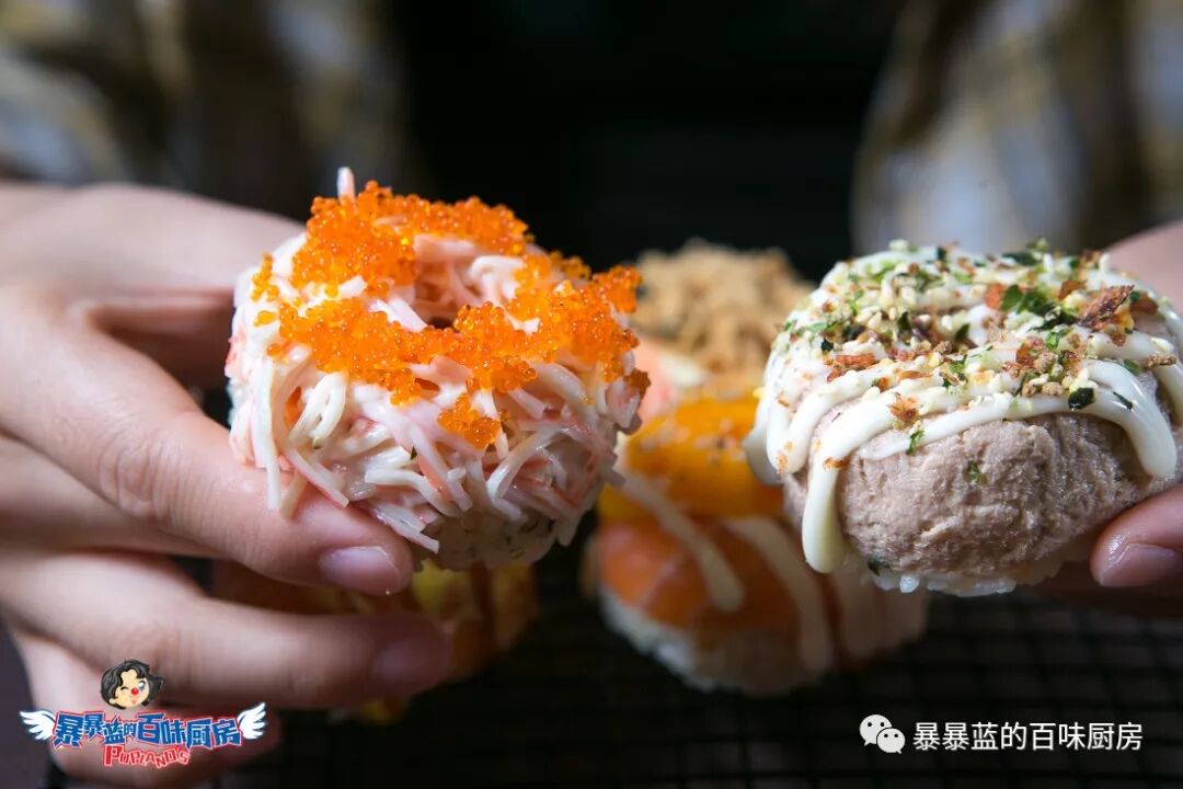 小火车还满足不了你的拍照欲望,那就只能请出甜甜圈了,6种口味的寿司做成甜甜圈的形状,放心吃,这个甜甜圈吃不胖的!