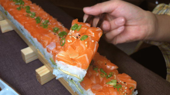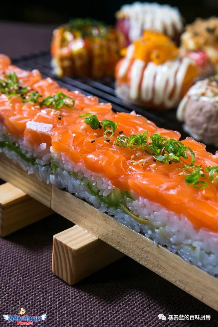 这是日本的箱寿司,海量三文鱼参与,中间夹上牛油果,一个容器装不下,三个托盘接在一起才行!