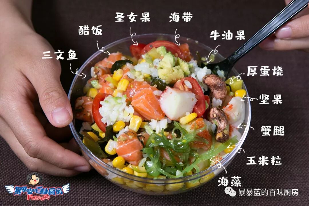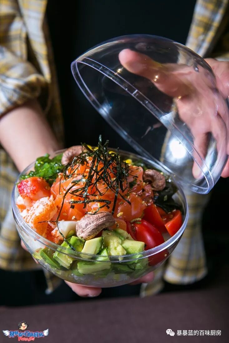 饭是醋饭,手工酿的醋,赋予米饭酸酸的底味,鱼生有三文鱼和蟹腿,三文鱼是法罗群岛的深海鲑鱼,蟹腿是日本的蟹腿,还有牛油果、厚蛋烧等9种馅料,这么跟你说吧,这一碗波奇饭就够做出一份豪华寿司拼盘!