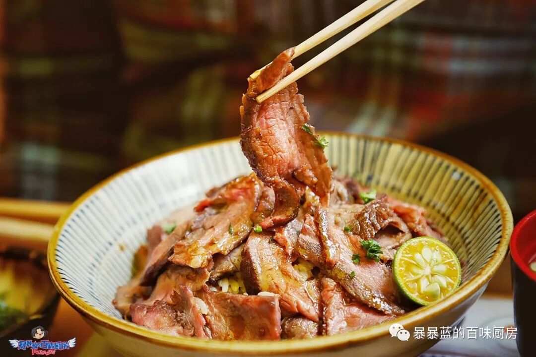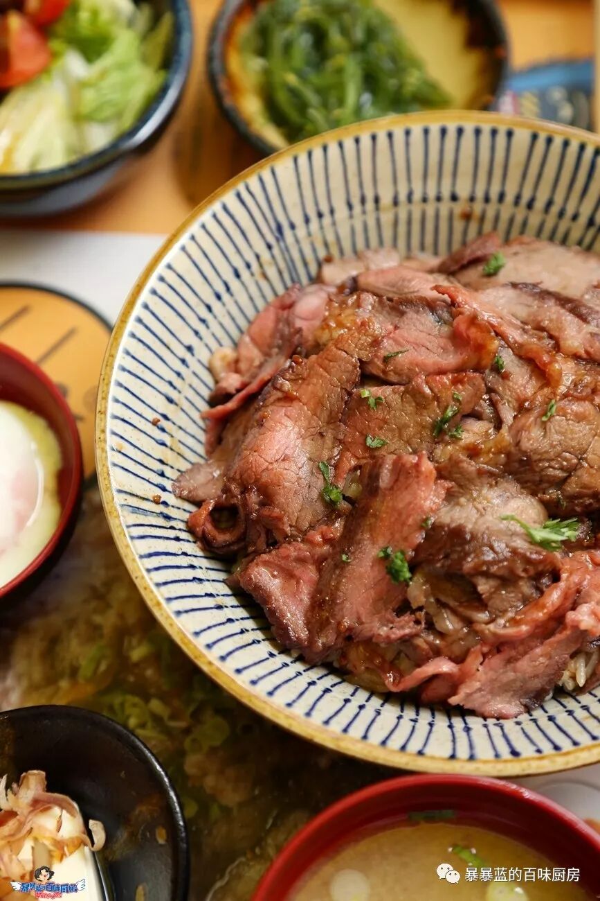 安格斯谷饲的牛眼肉,纹理漂亮,油脂丰富,上铁板煎熟,然后斜刀切成厚片,淋上甜甜的酱汁,虽然降临在了米饭上,但品质不输任何牛排。