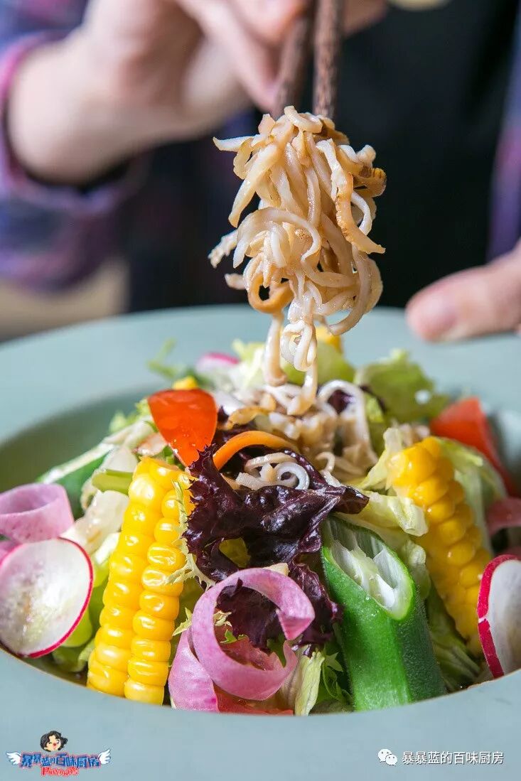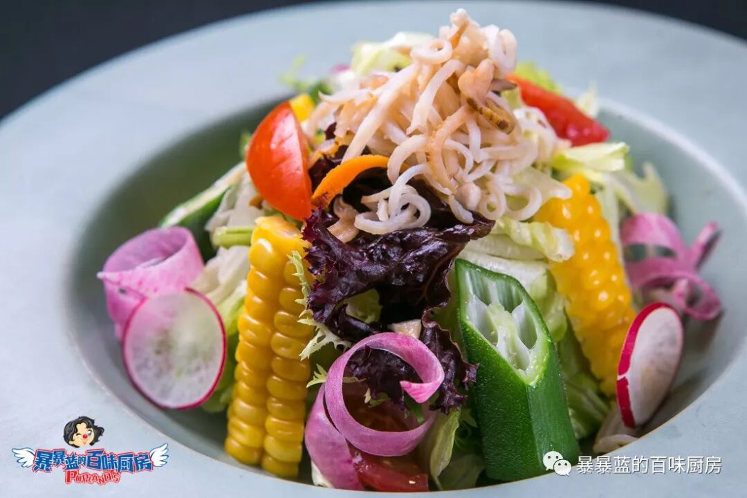 象拔蚌经温水烫一下立刻卷起,与不同颜色的蔬菜一起,搭配成了另一款清新的鲜。