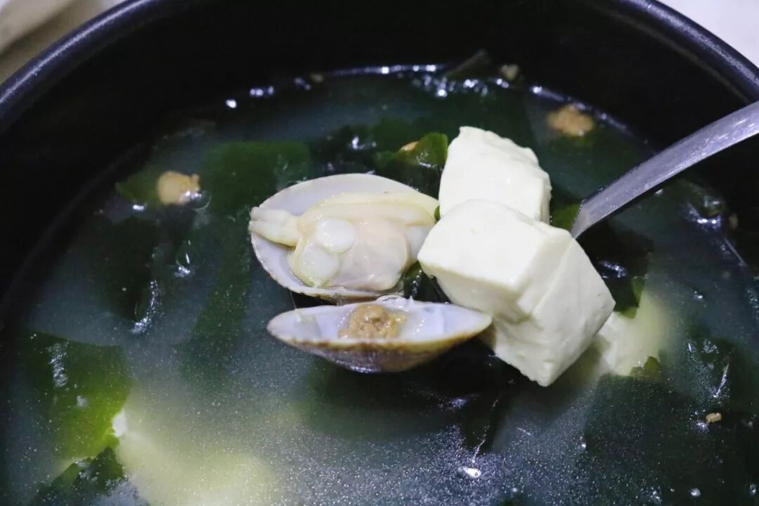 北北吃韩式料理必点海带汤,食膳轩的海带汤额外加了花蛤和豆腐,清爽中带着海产特有的鲜,让人欲罢不能~