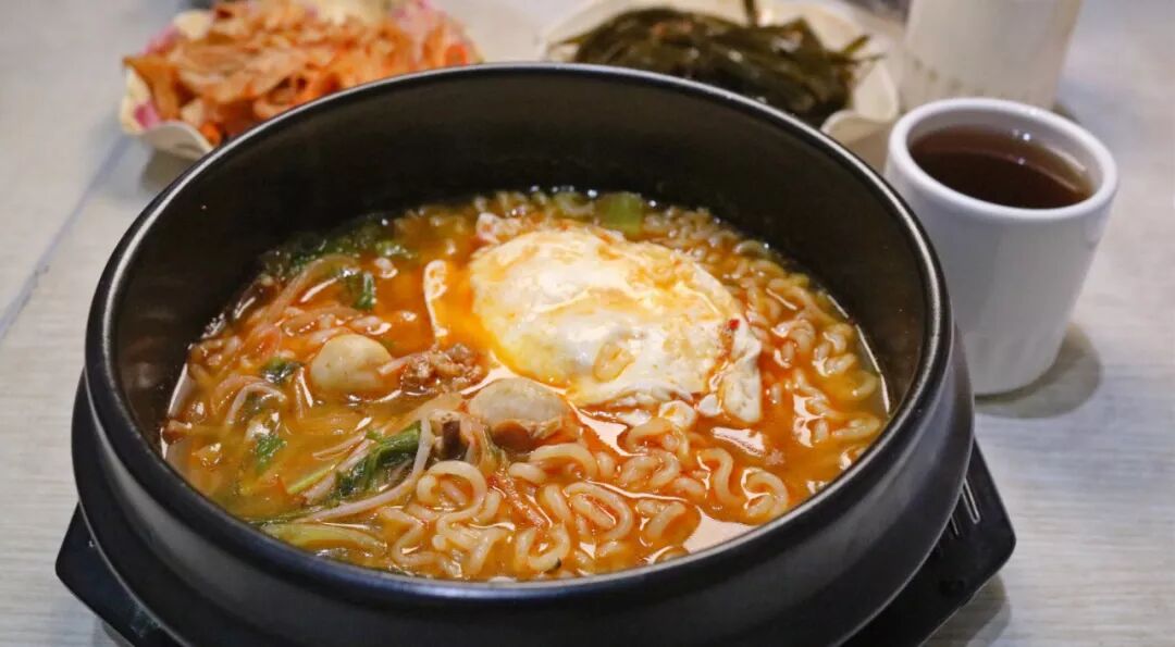 韩式辛拉面,思密达最爱的韩式泡面,料放得很足,光是配菜就有七八种,中间还要再卧一颗鸡蛋。