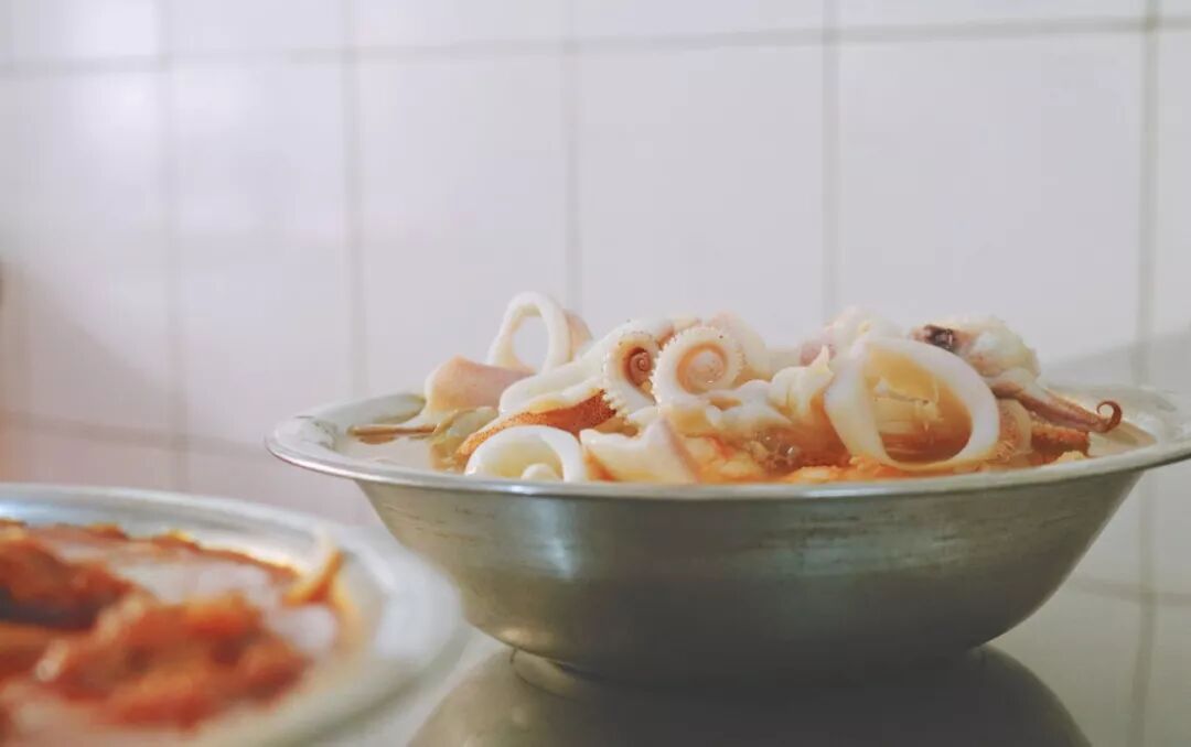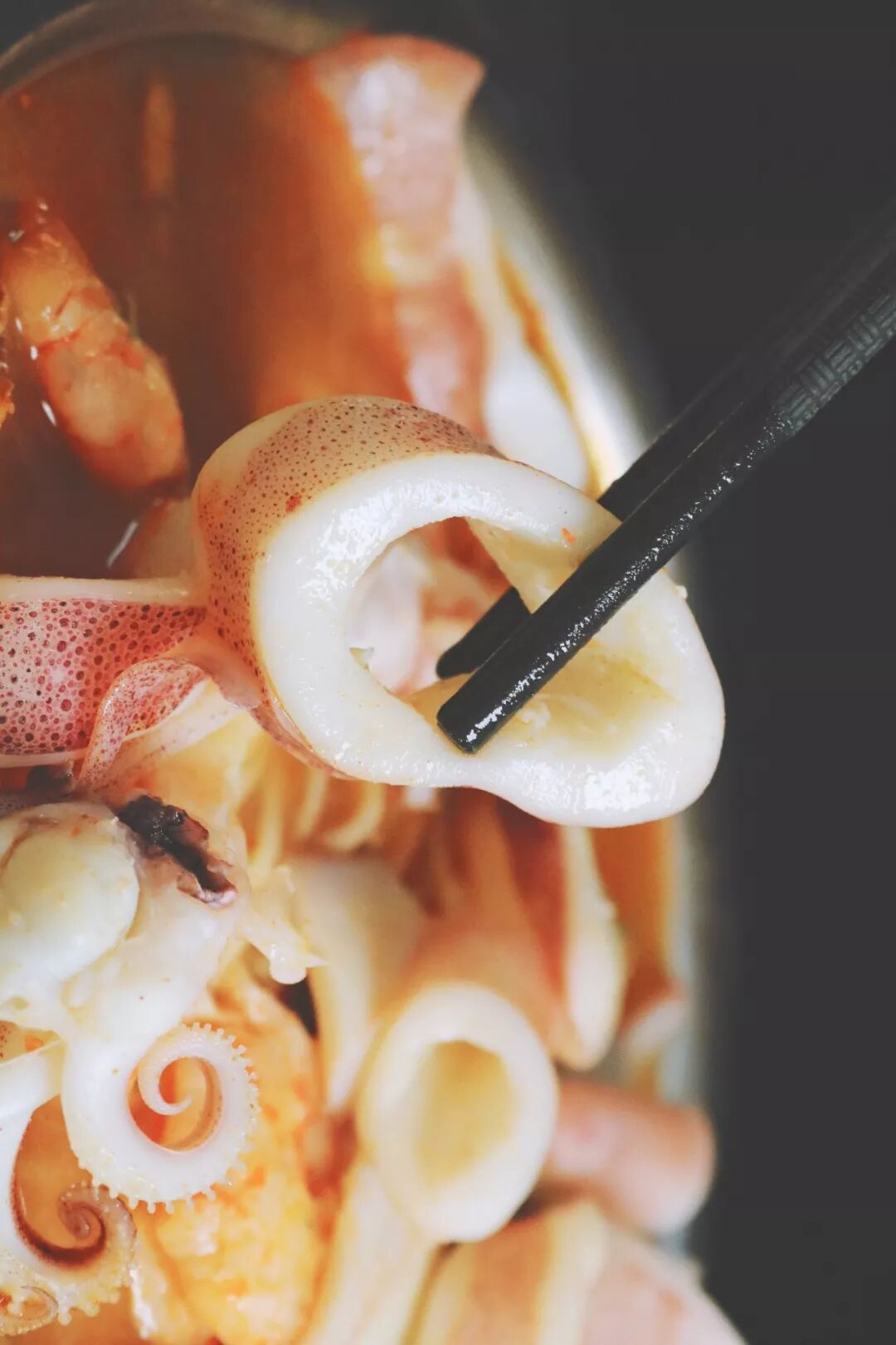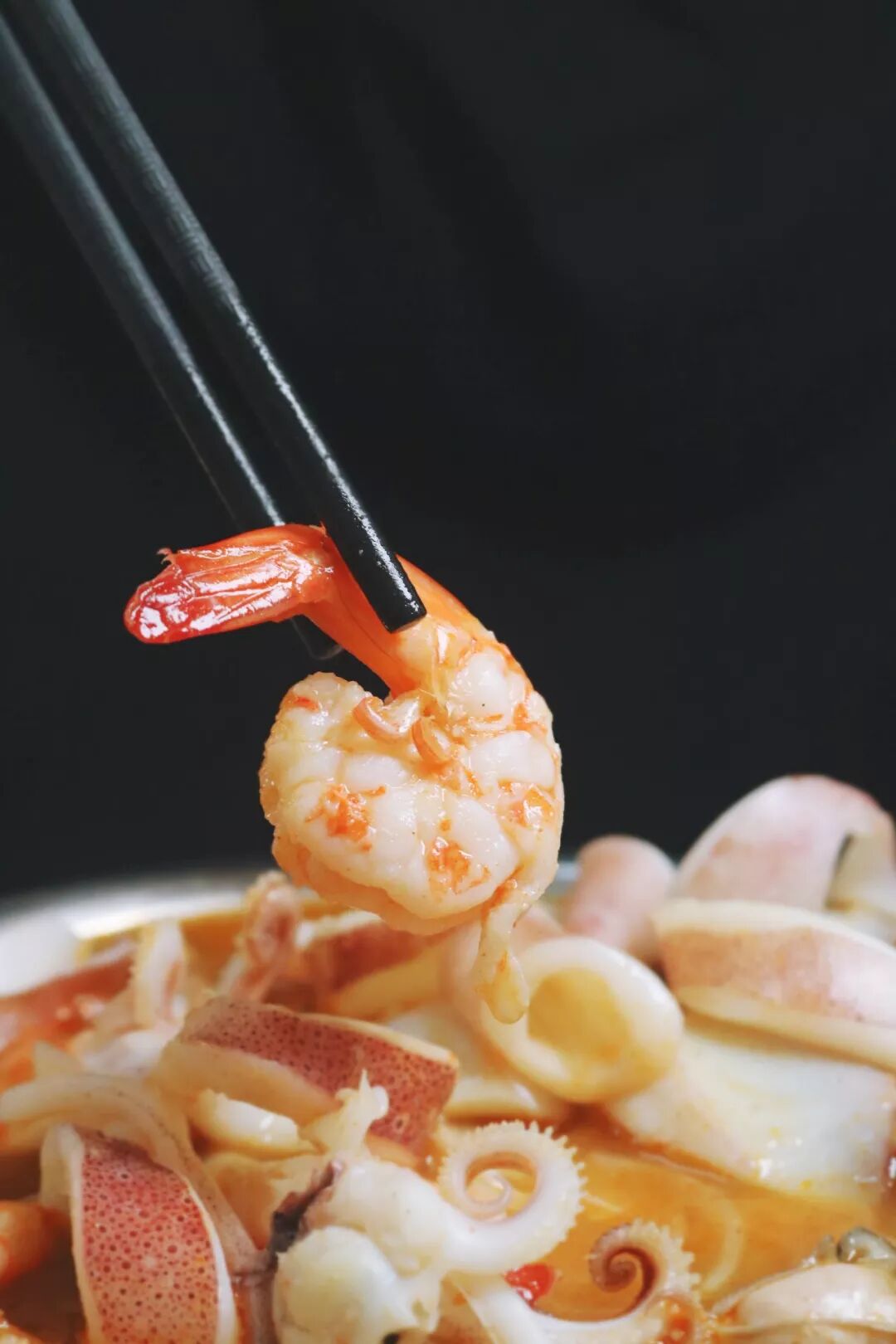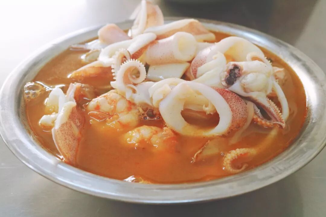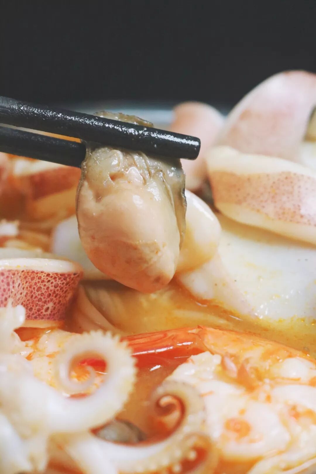 另一份我们点了鱿鱼、鲜虾、海蛎的海鲜拼盘,鱿鱼Q弹虾肉紧实饱满,海蛎个头大又新鲜,加上沙茶汤底作陪,吃的时候词穷到只会说“好鲜好鲜”。