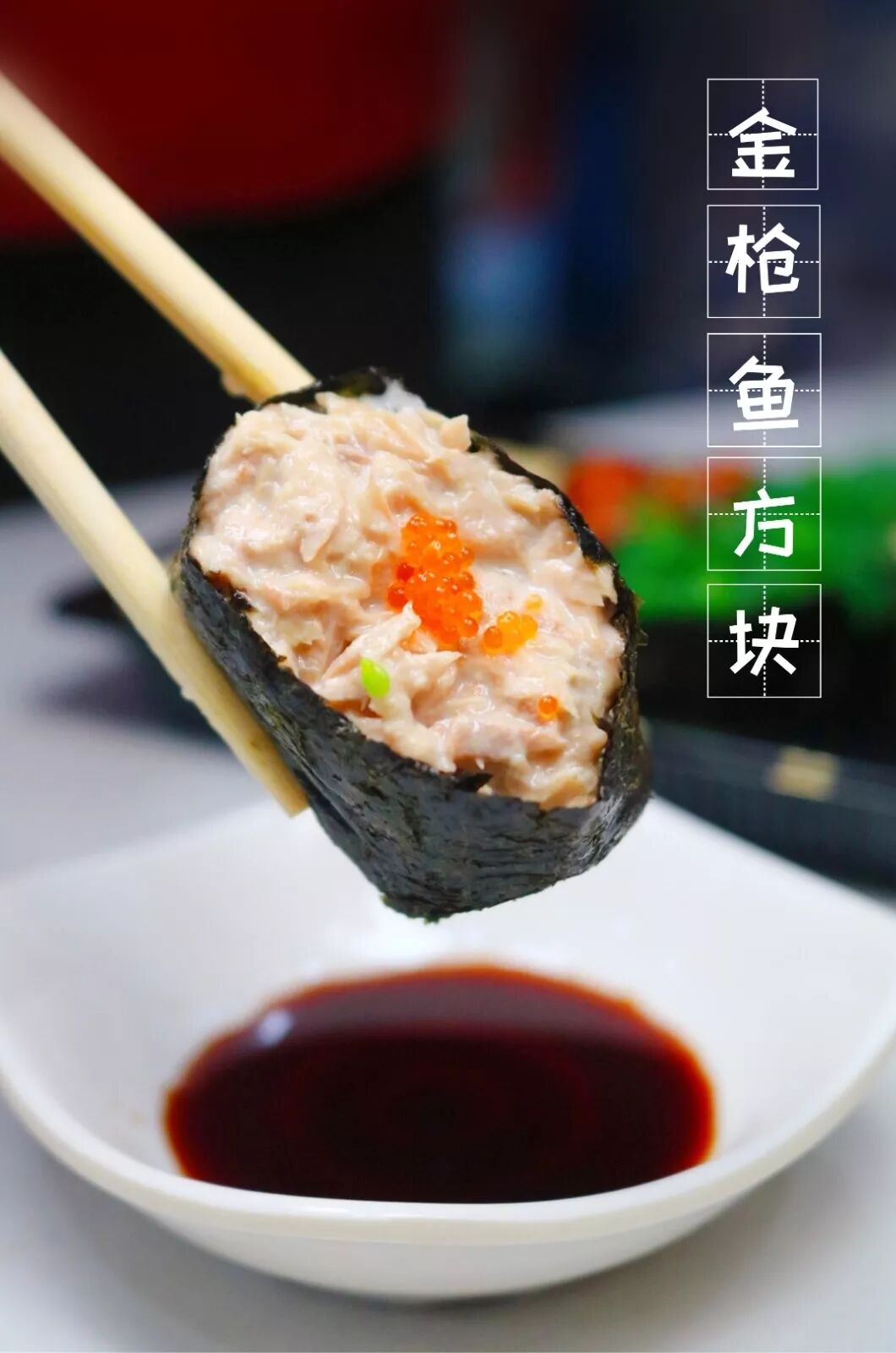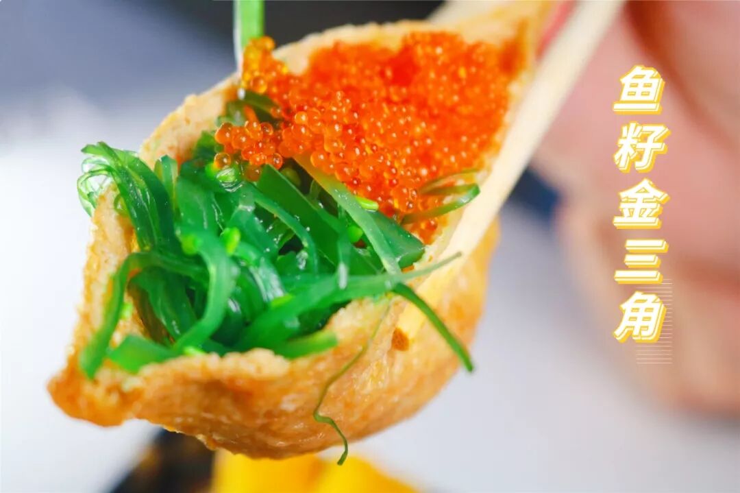 鱼籽金三角用料就过分了,满满的蟹籽和海草堆砌在上面,轻轻一撩就倒~
