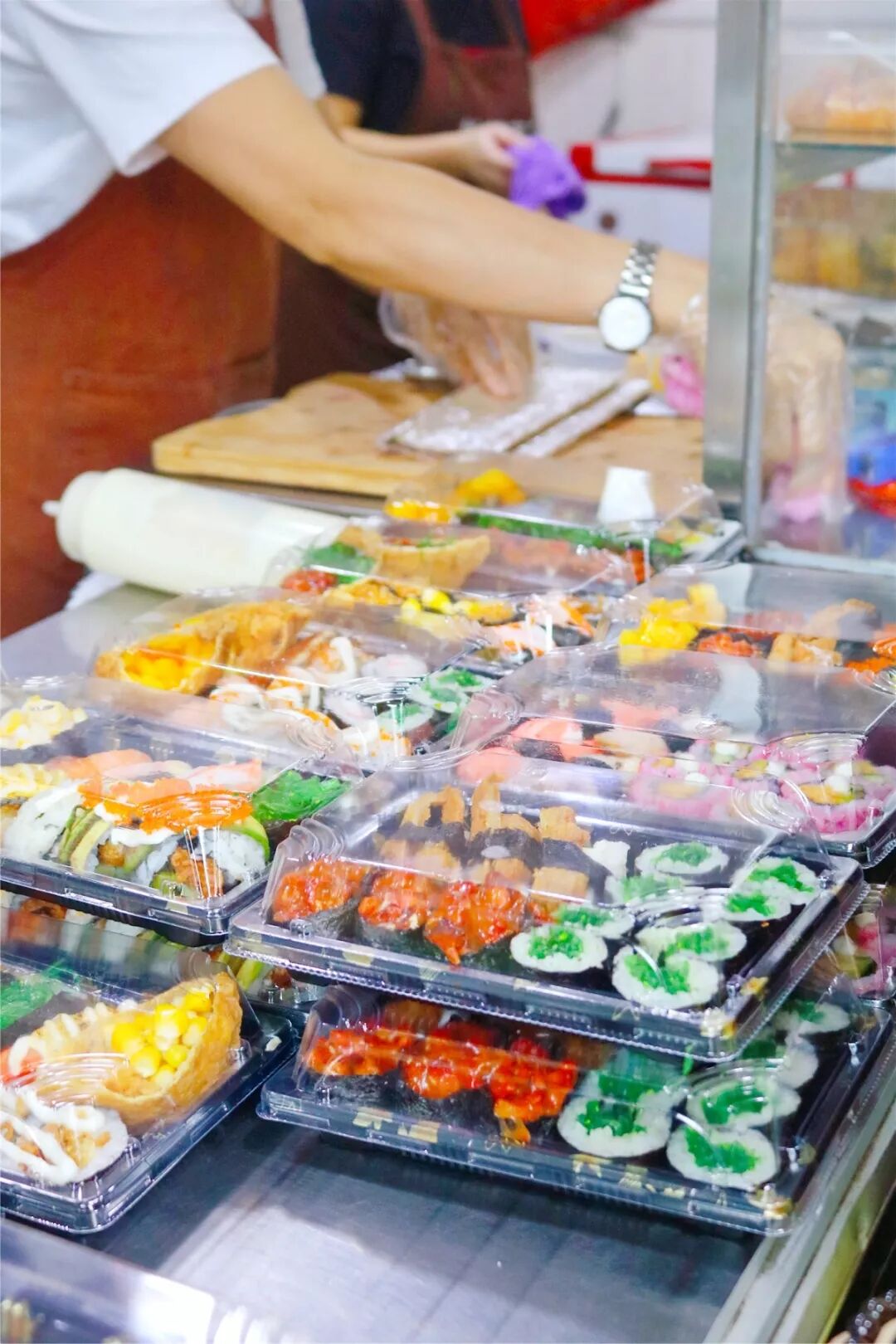 北北是四五点到店的,学生们都还在上课,这个时候的老板娘正在忙碌的准备着寿司拼盘。