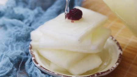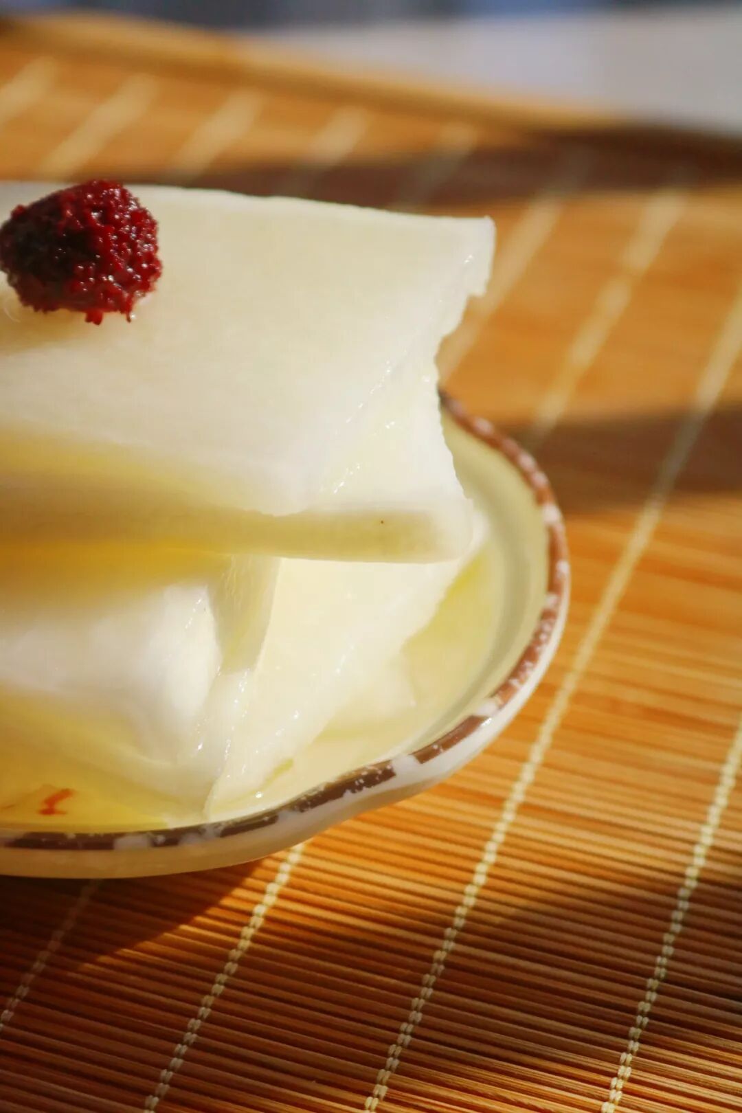 萝卜切成均匀的厚片,加盐、白糖、食醋,经过时间的洗礼,就成了清凉败火的菜头酸。