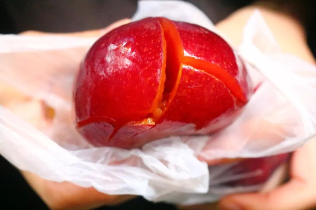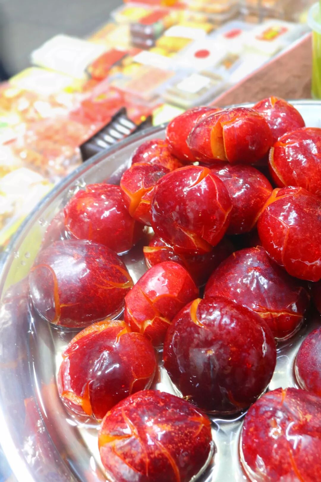 胖李子压出裂口,加冰糖用秘方腌制,腌出来的李子才能酸酸甜甜,清脆可口。