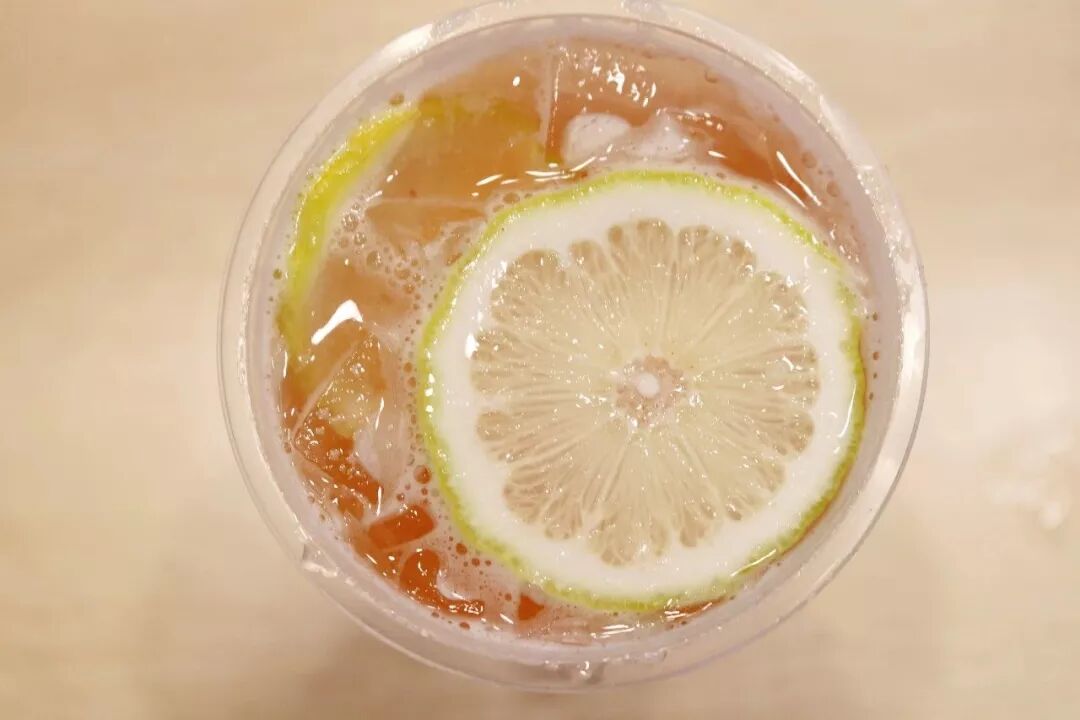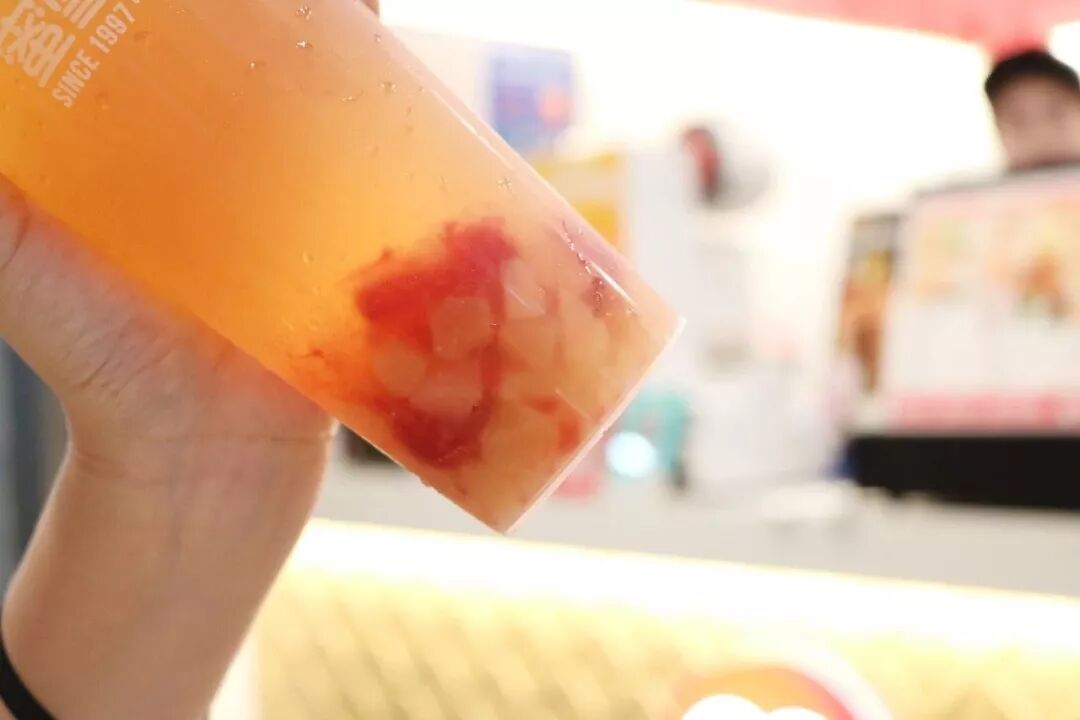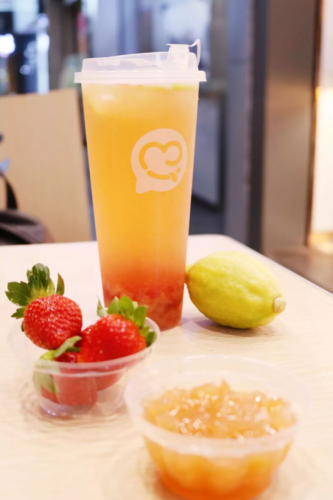 香水柠檬是现切的,茶水澄澈透亮,口感清甜,加的草莓果粒和水蜜桃果粒很好吃哦~