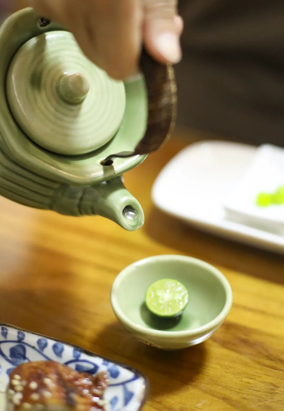 将汤倒在一个装有柠檬片的小碟子里,鲜咸甜甜的,搭配刺身刚刚好。