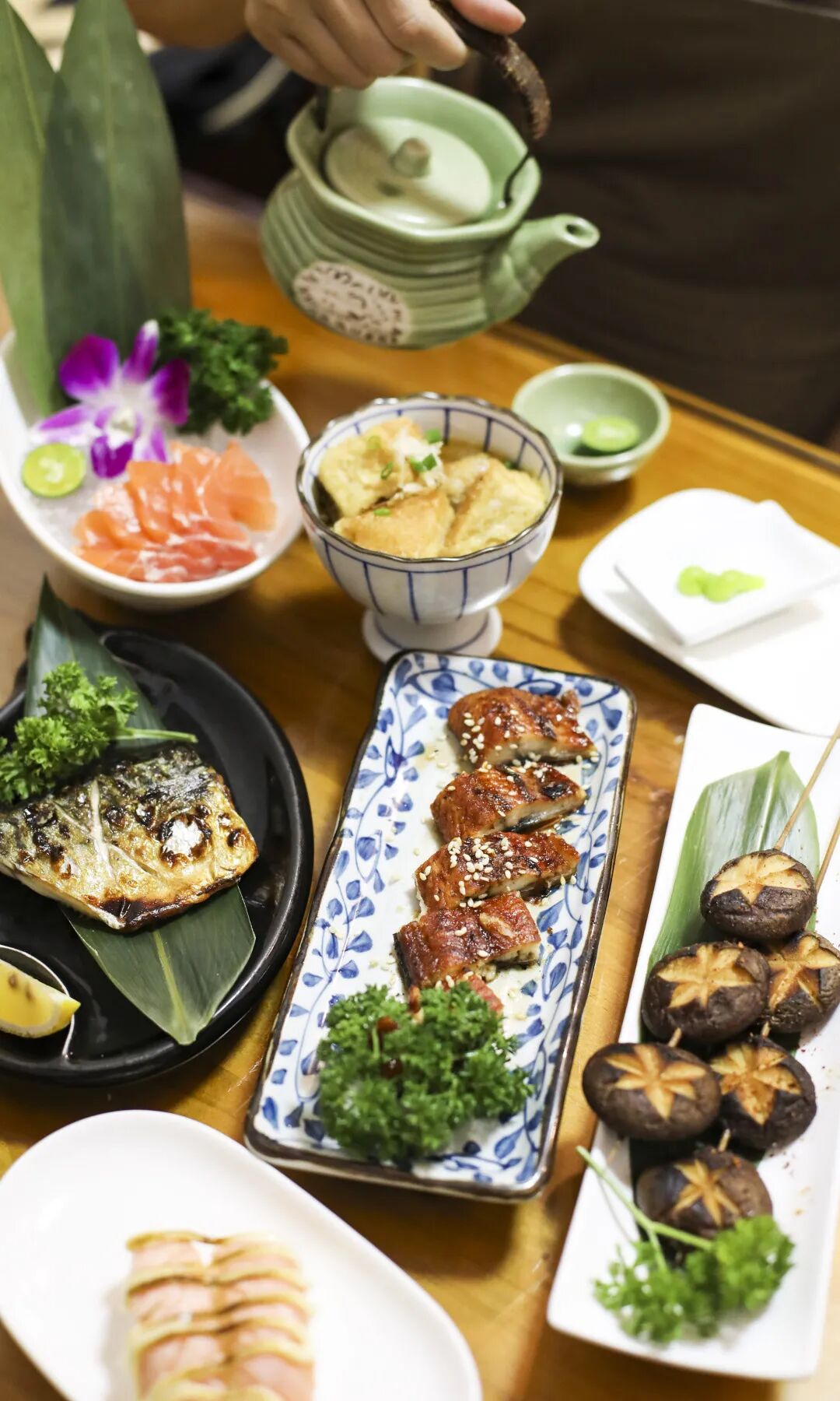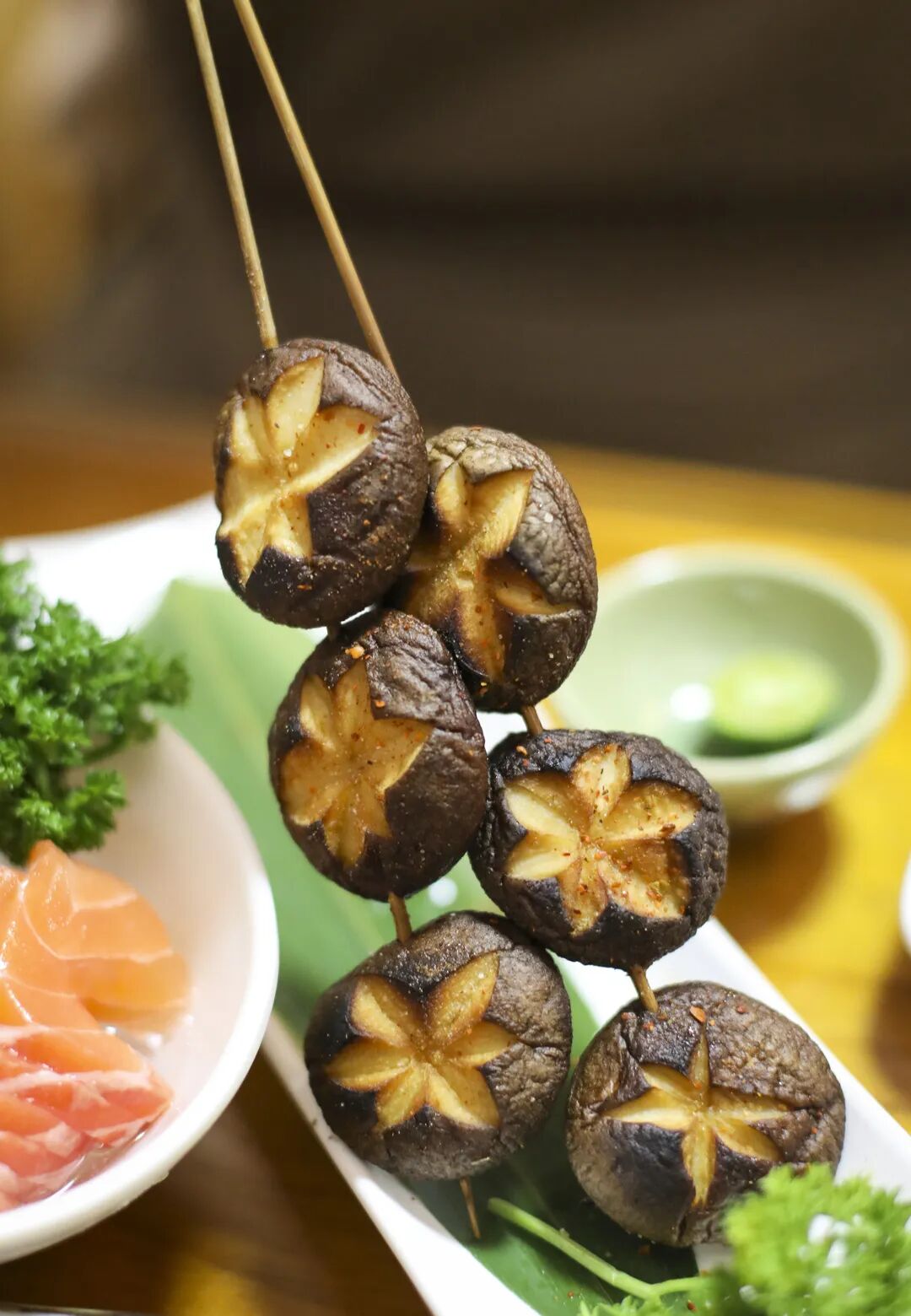 切得厚实,纹理清晰可见的三文鱼刺身;抹上芝士,炙烤后别有风味的三文鱼寿司;以及保存香菇原汁原味鲜香的烤香菇串,随便点都不会踩雷。