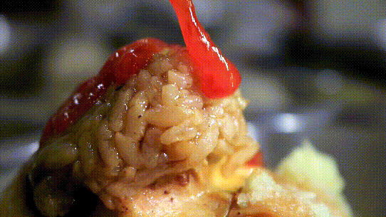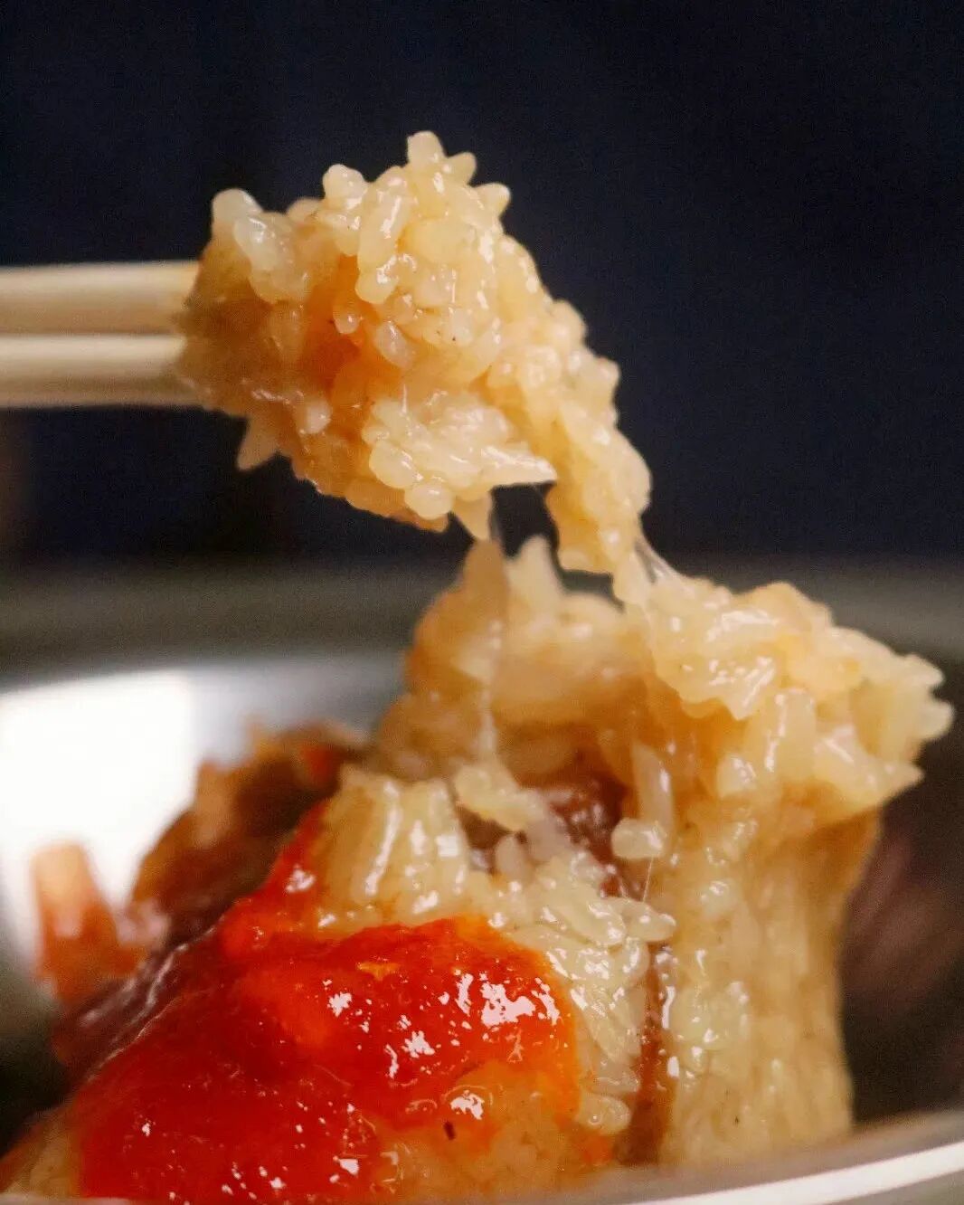 热气腾腾的肉粽上桌前得浇上店内特质的甜辣酱和炸葱油,才能真正激发出它的味道。