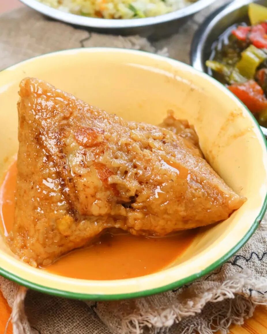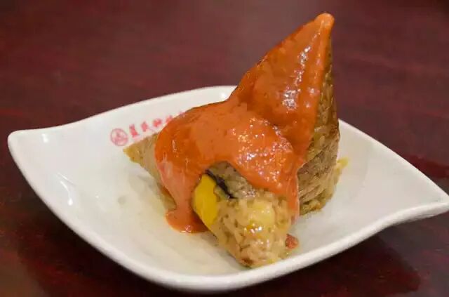 他家的肉粽可以吃到卤蛋、香菇以及香糯的五花肉,糯米粘上酱汁很入味。蘸料里加了醋和甜辣酱两种调味,酸味可以很好的解腻。