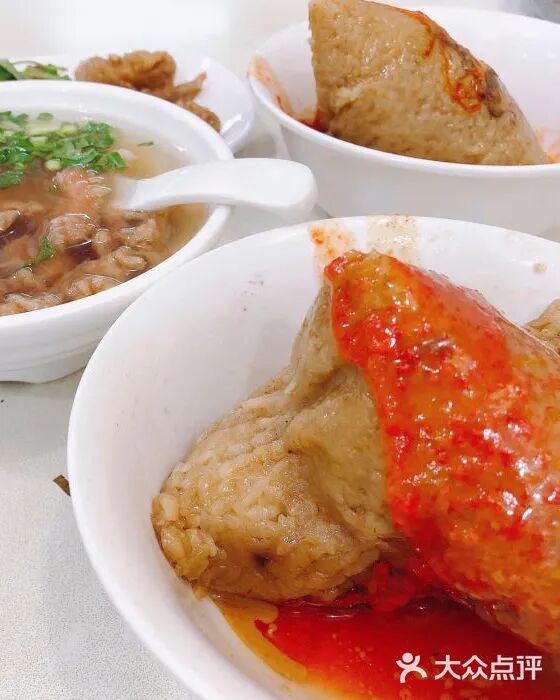 块头挺大,馅料挺足,有肉、干贝、鱿鱼和卤蛋。酱料相对来说会比较稀一点,肉粽下面是花生酱,上面是甜辣酱吃的时候建议搅拌一下,而且要趁热吃哦~
