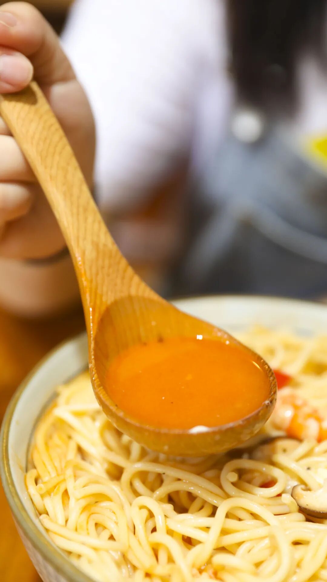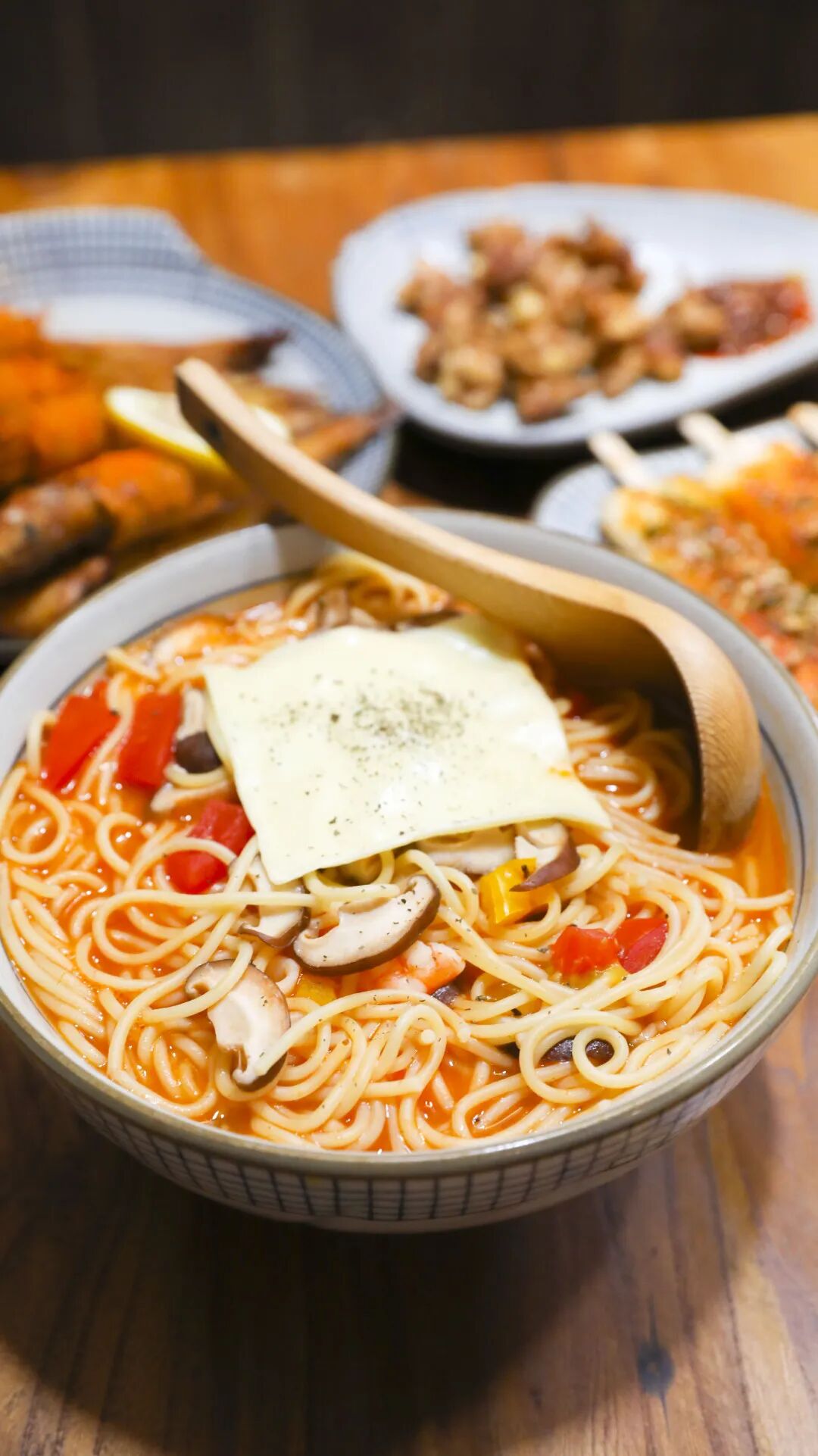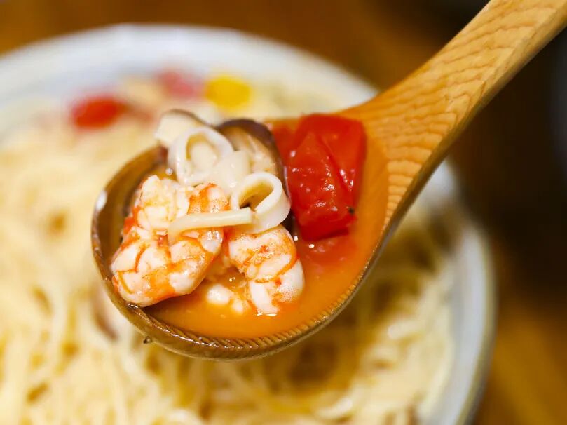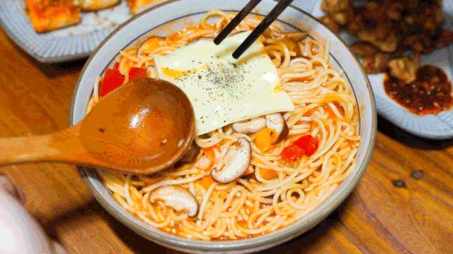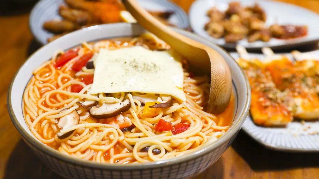 配料有虾仁、鱿鱼、彩椒、香菇,搭配番茄汤底,口味相对来说更偏中式一些。汤底浓稠却无腻味,芝士的加入让意面的口感更上了一个层次。