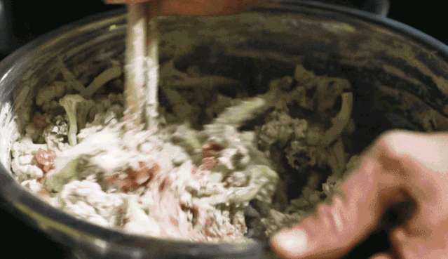 倒入开水,用筷子迅速搅拌,直至地瓜粉与配料形成黏合状。