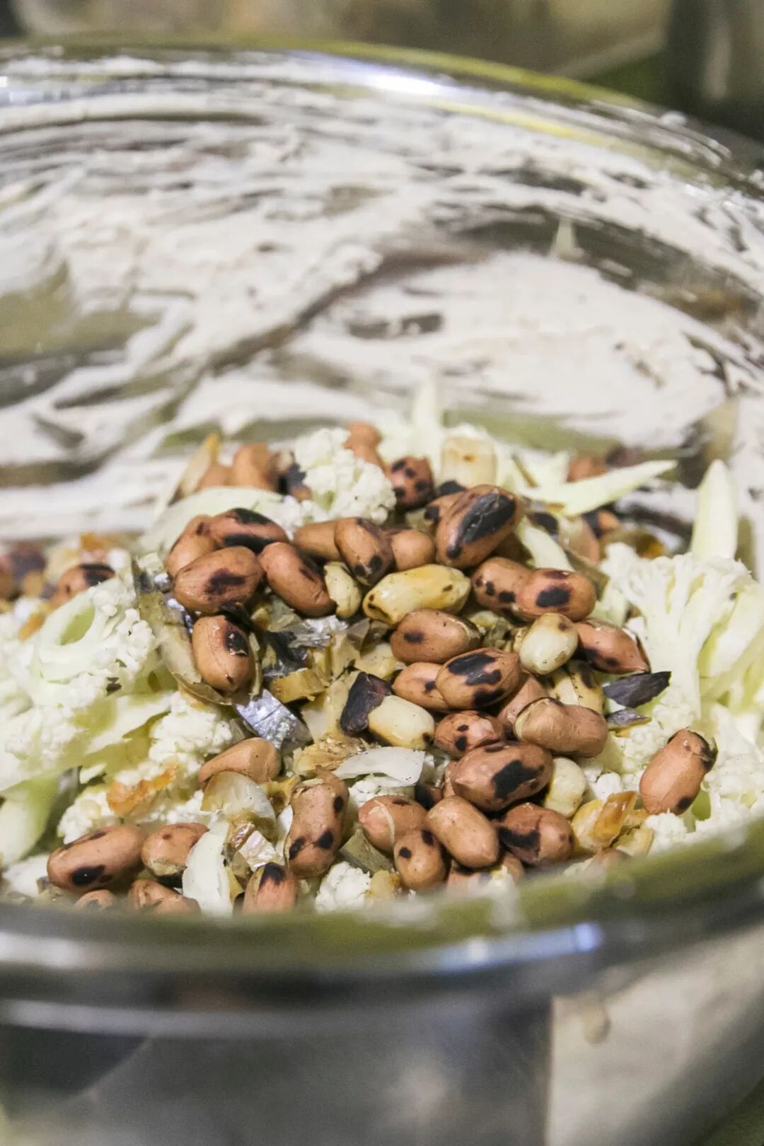 将切好的肉丝、花生、花菜等馅料放入小铁盆中,放入巴浪鱼干提鲜,再撒上磨细的地瓜粉。