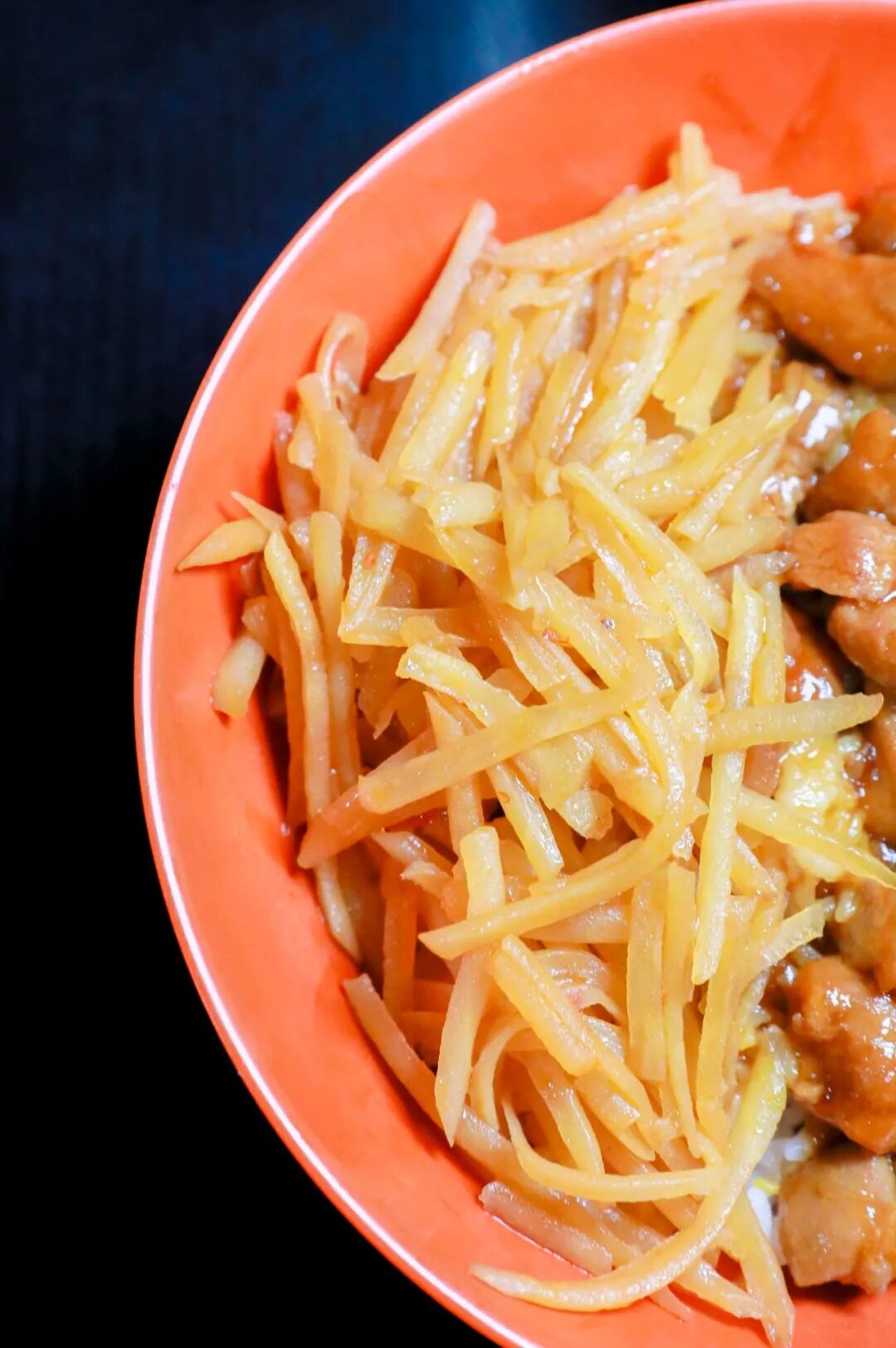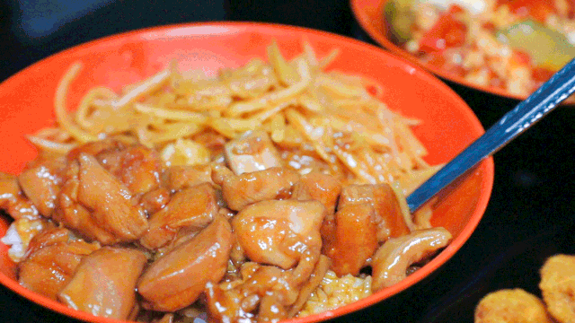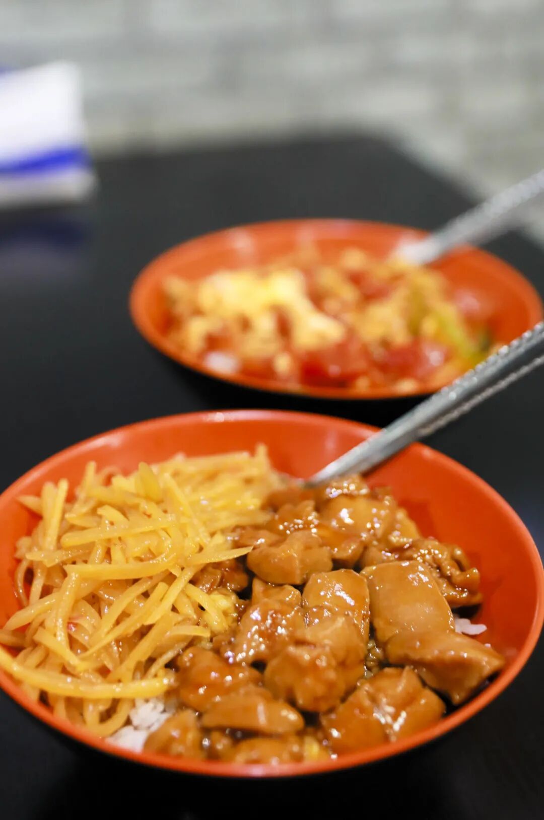 一半土豆一半鸡肉,荤素搭配。他们家的盖饭有自己特调的酱汁,味道咸甜咸甜的。
