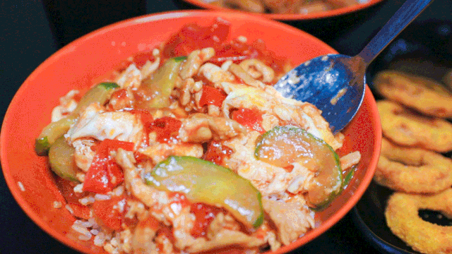 说是西红柿滑蛋,但里面还有少许的肉条、黄瓜片稍稍点缀,不管是在视觉上还是味觉上,都让人直咽口水!