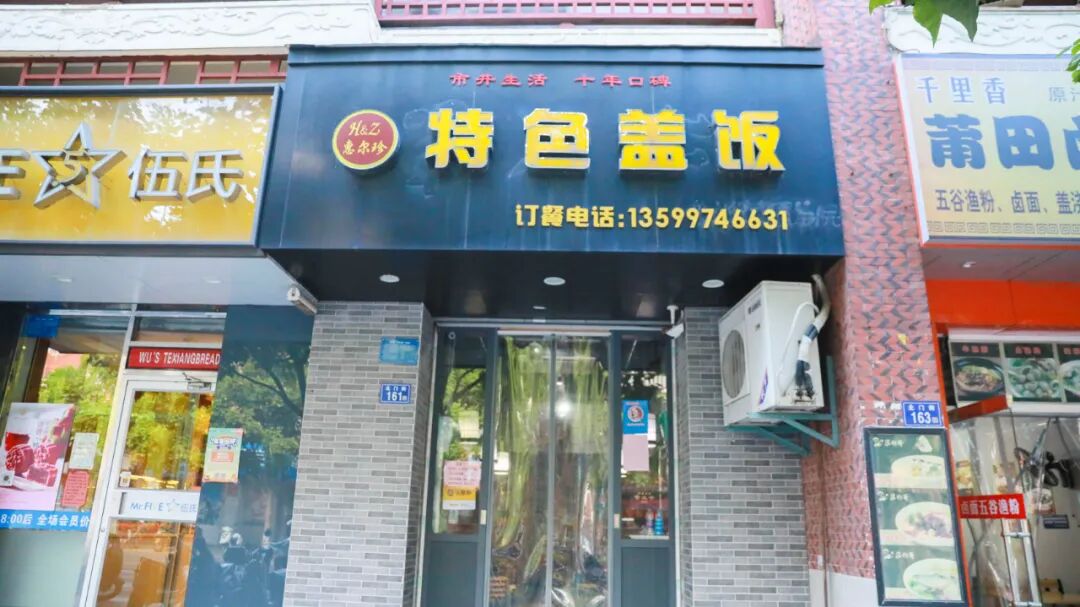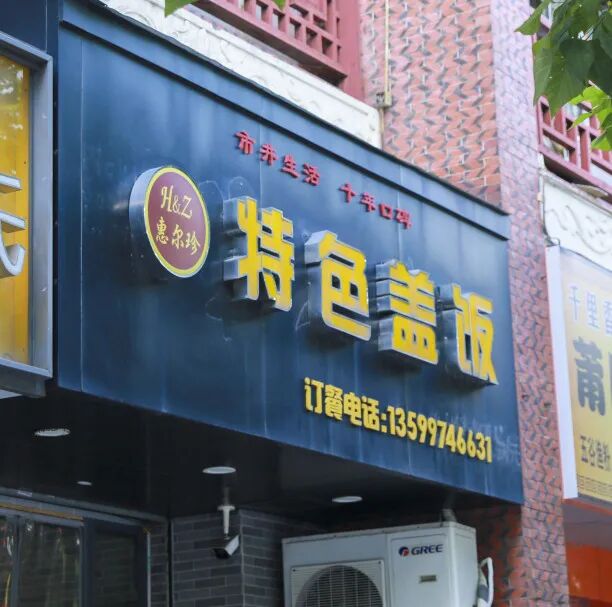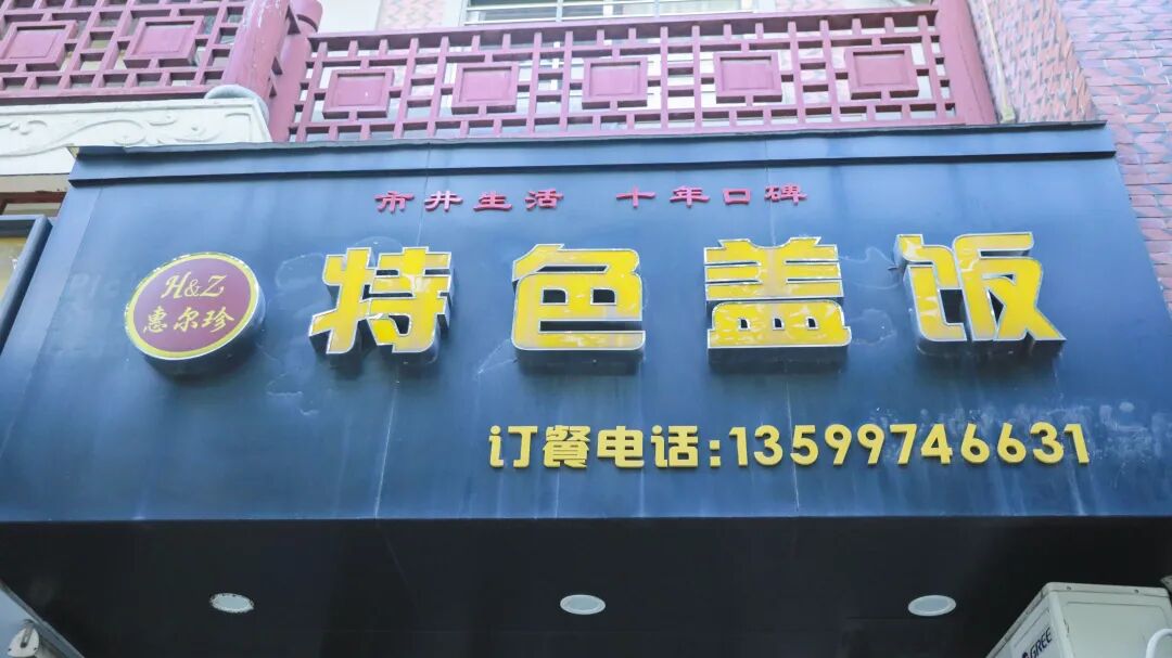 在六井孔入口处,对着朝天门的方向往前走两步,便可以看到他们家的招牌“惠尔珍特色盖饭”。