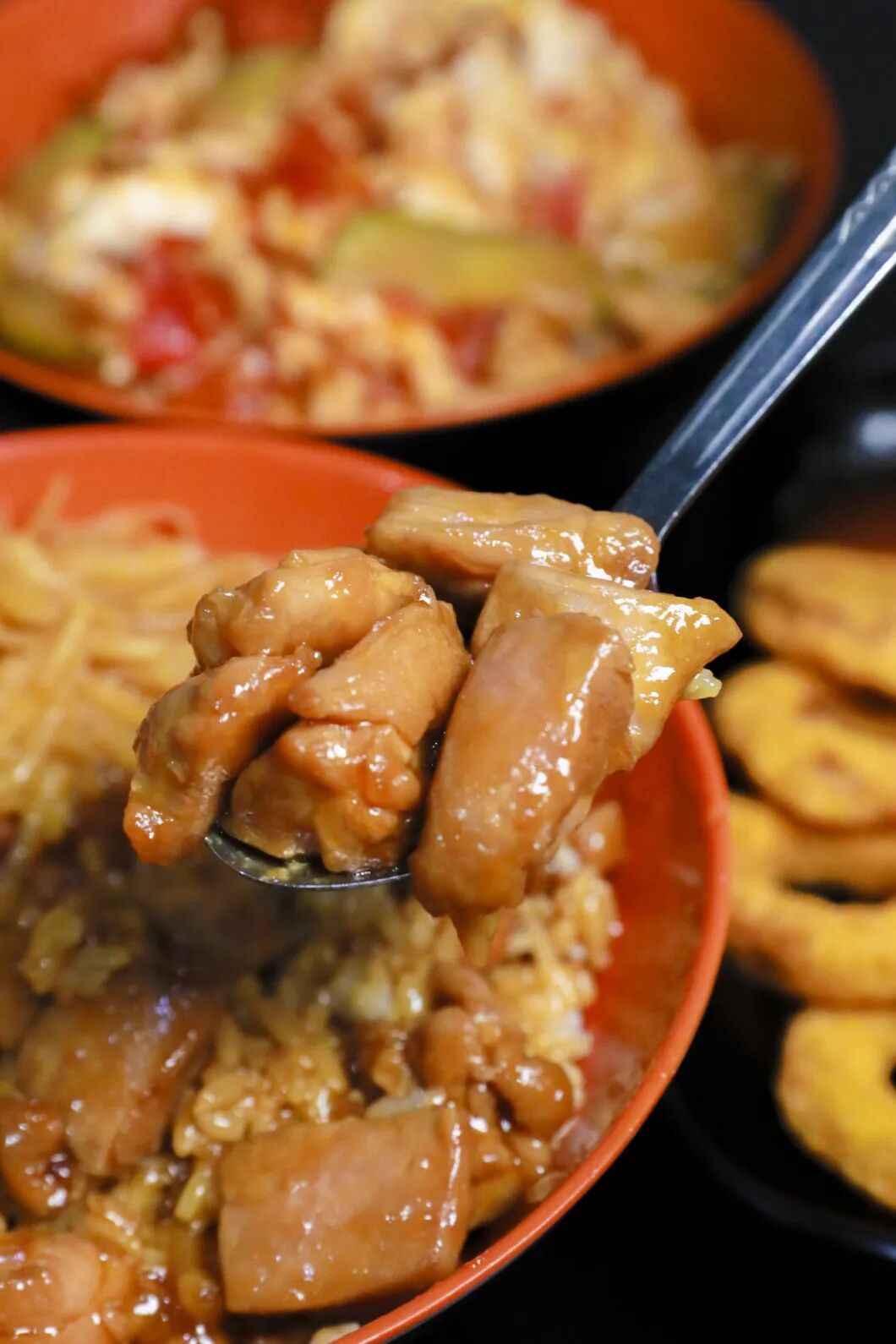 鸡肉是提前腌制好的,软烂入味,浓郁的酱汁包裹着滑嫩的鸡肉,再配上一口热乎乎的米饭,真的好吃到想舔盘...