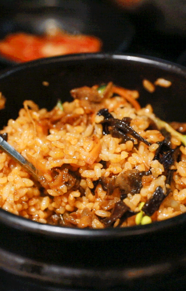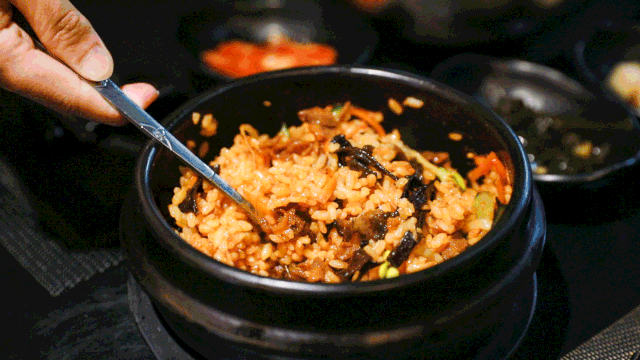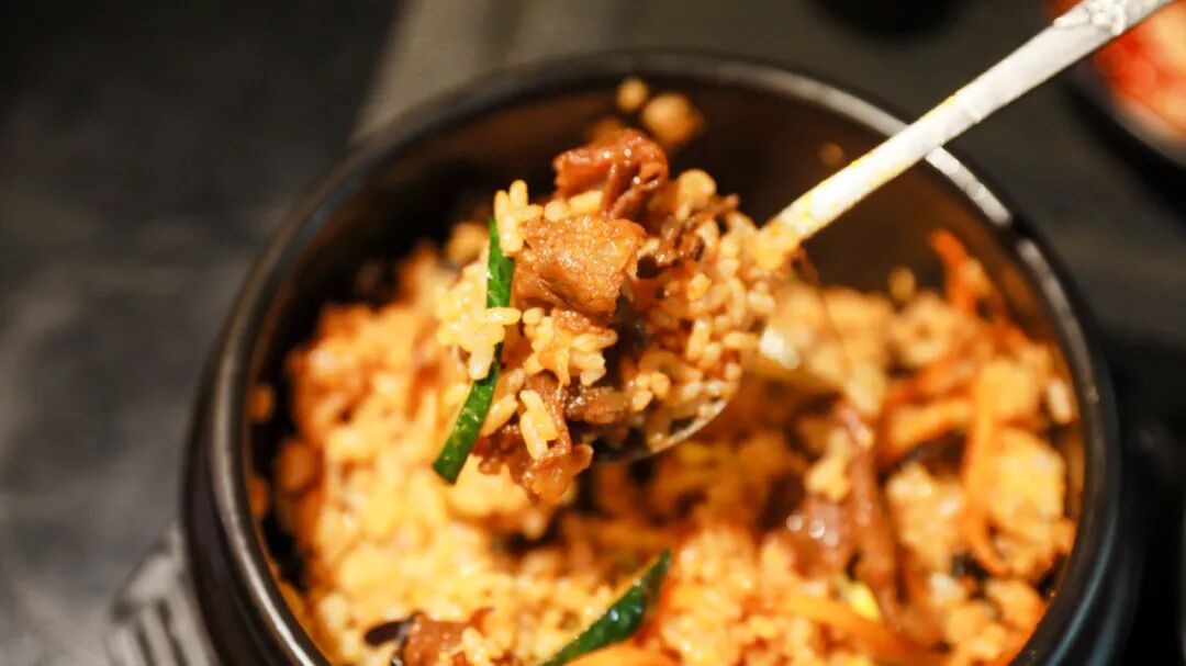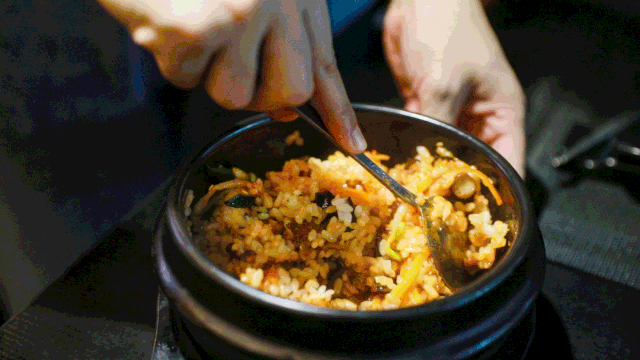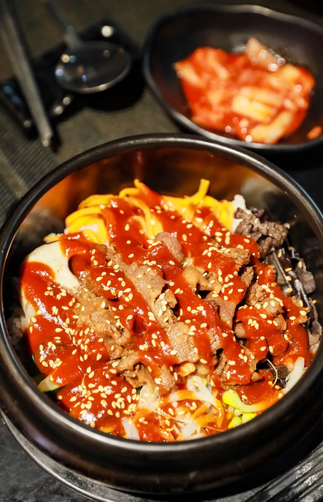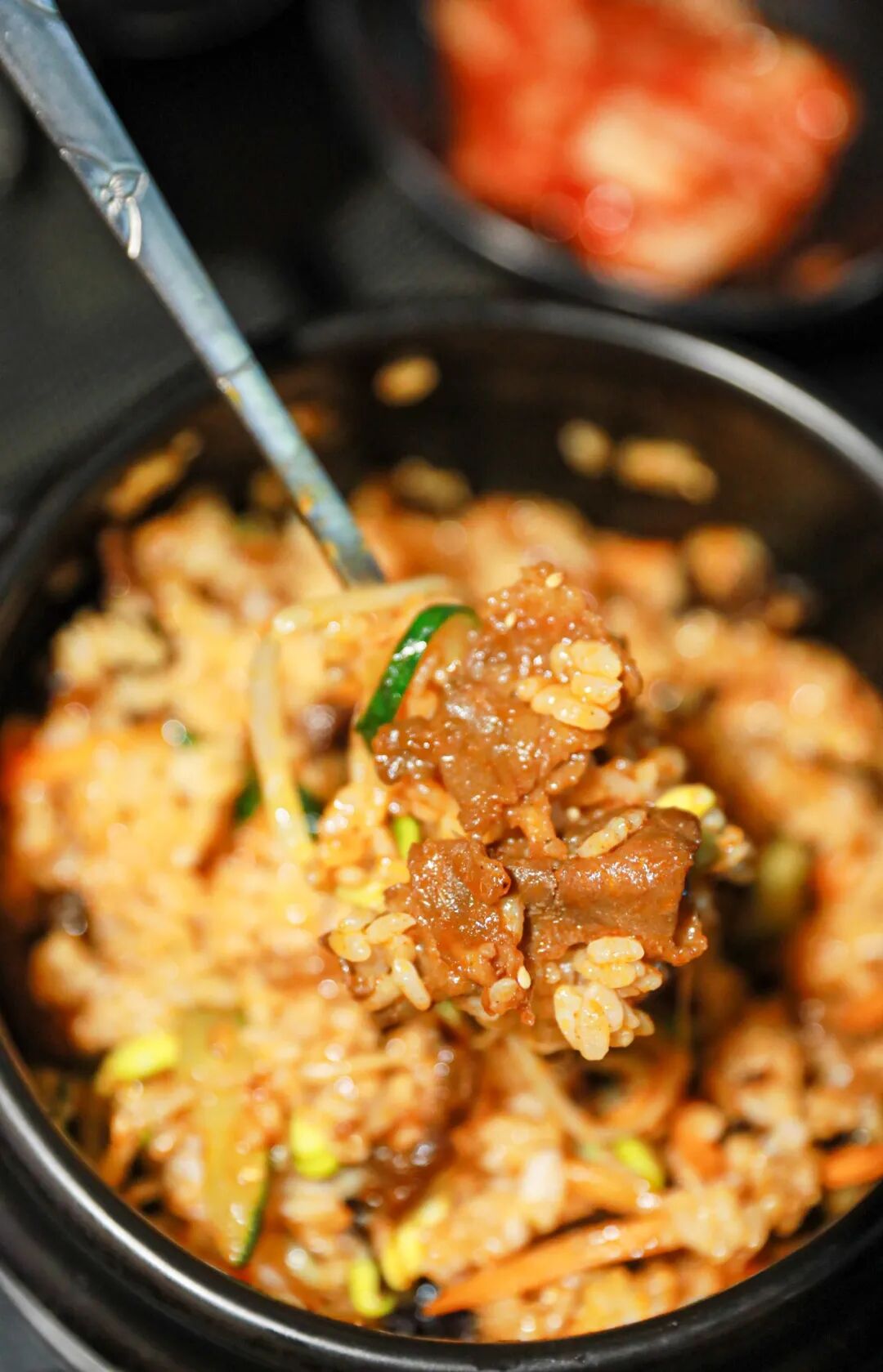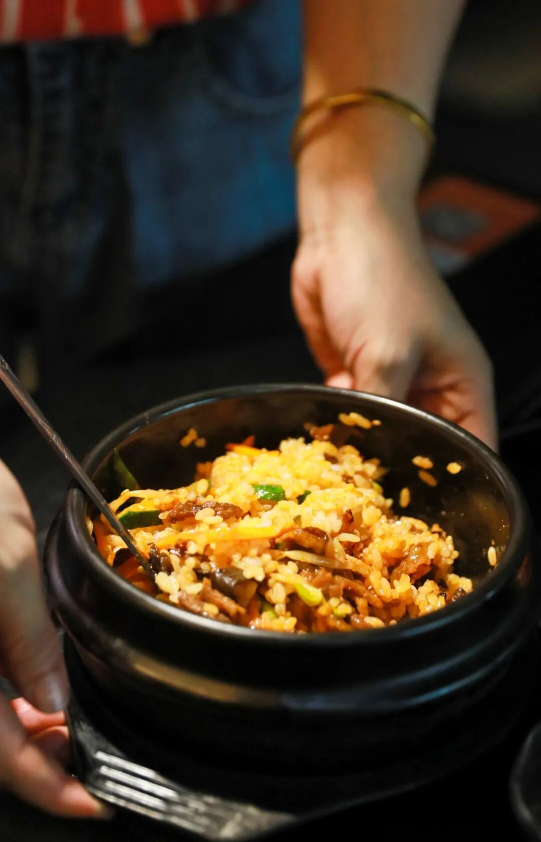 舀一大勺,米饭软糯、锅巴焦脆喷香,牛肉混合各式蔬菜和拌饭酱,一口下去饱满焦香,超满足!