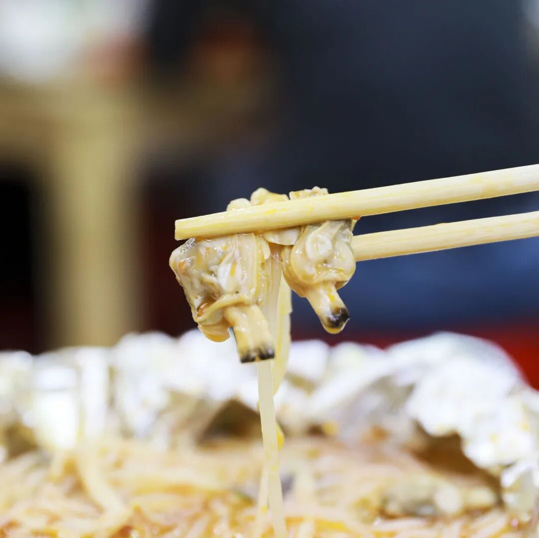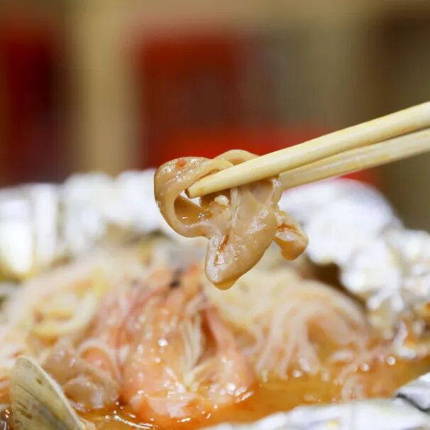 轻夹起一颗花甲,用筷子拽出花甲肉,肉质细嫩鲜甜 ,秘制酱料加入让汤汁更加浓郁鲜美。