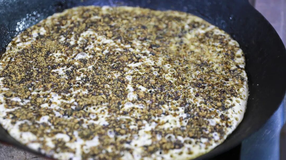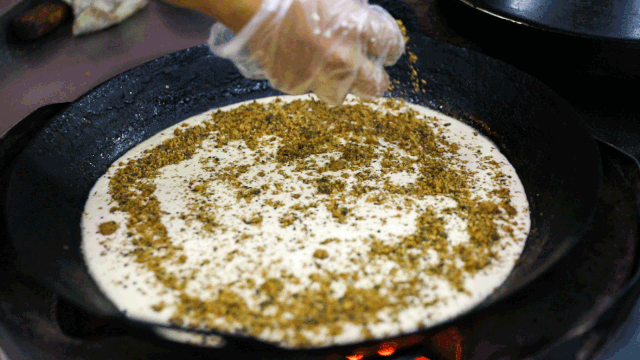 绕着圈把面浆倒入“平鼎”,待面浆微微冒泡,再撒上红糖 、冬瓜条,2-3钟后便可起锅。