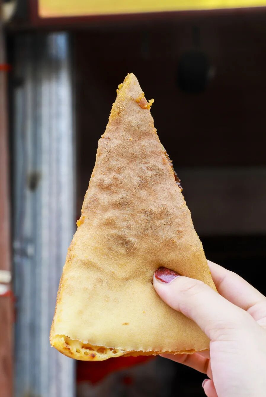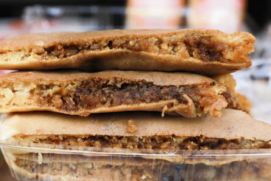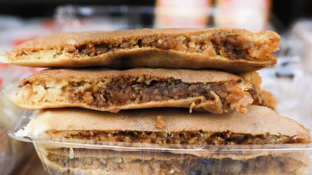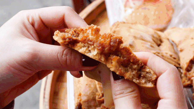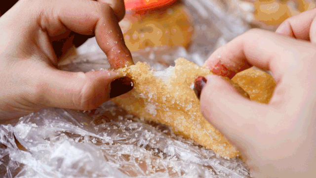 刚出锅的满煎糕冒着热腾腾的香气,月熊买的是原味红糖的,糕体很松软,撕开便可看见清晰的蜂孔夹层。