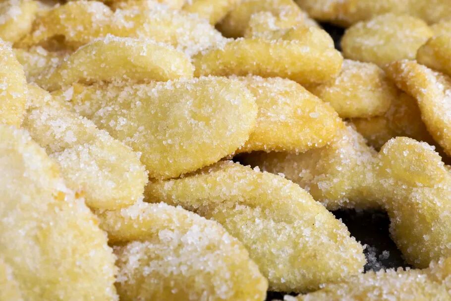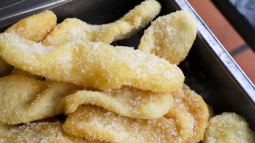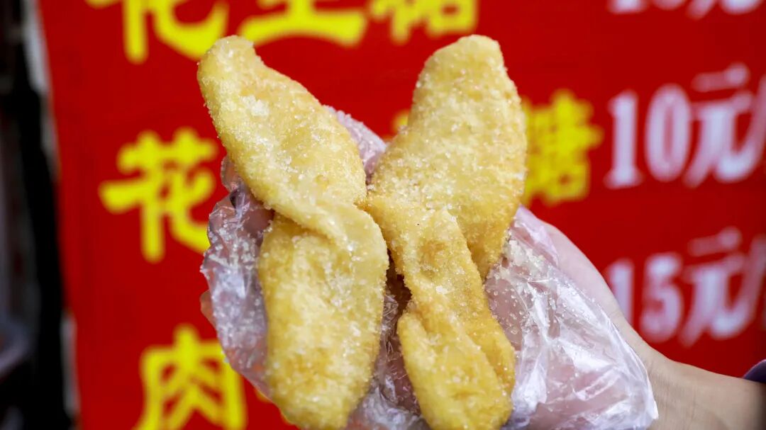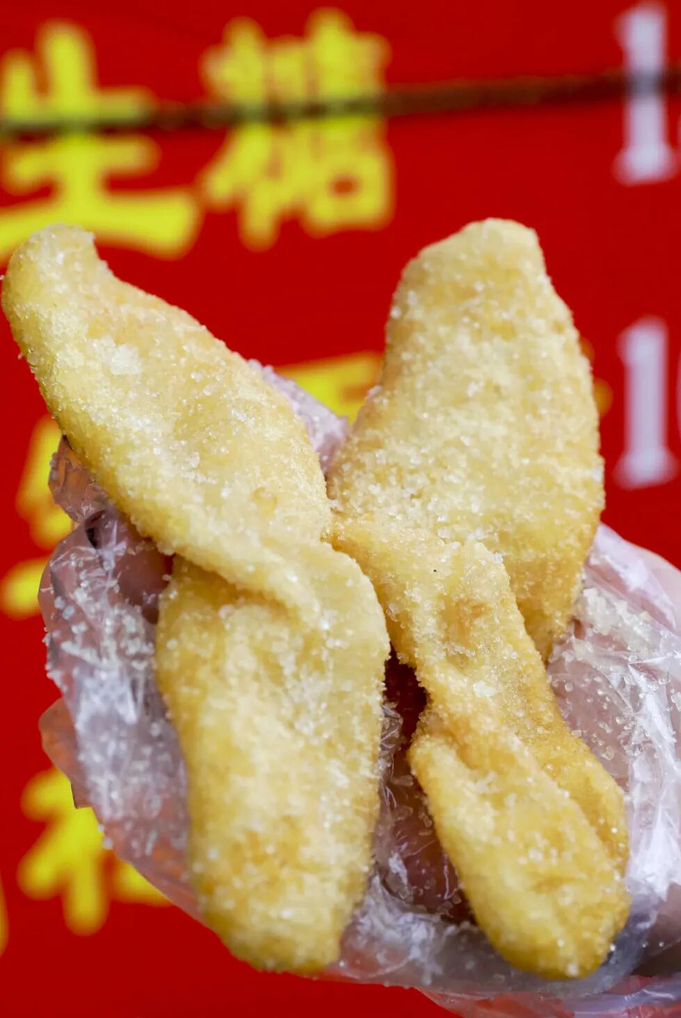 新下锅的甜油䭔在油锅里被炸至金黄后捞起,再裹上一层白砂糖,制作完成的甜油䭔,白糖的味道迎面扑来。