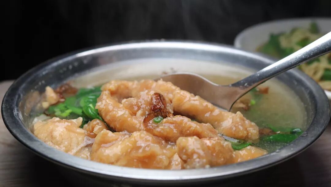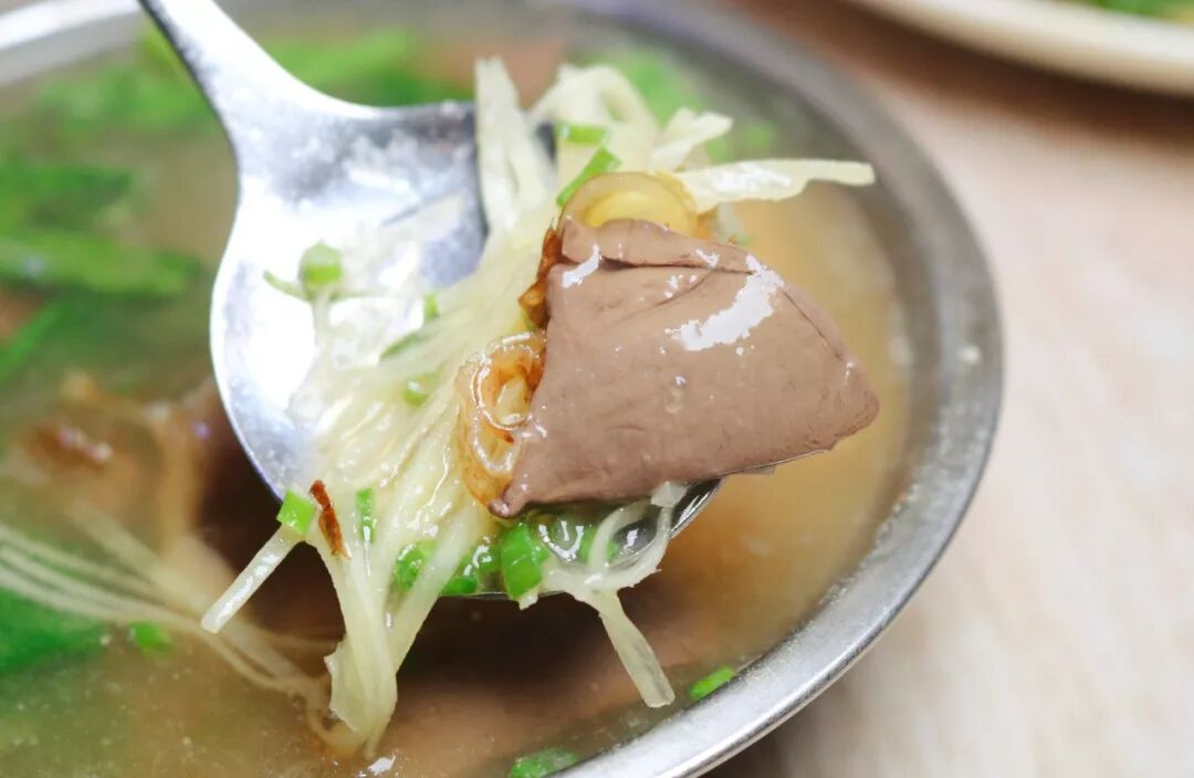 特别腌制过的大肠,外头裹着晶莹剔透的地瓜粉,爽脆耐嚼。里面还加了嫩滑的鸭血,在浓汤中吸取精华,越沉越香。